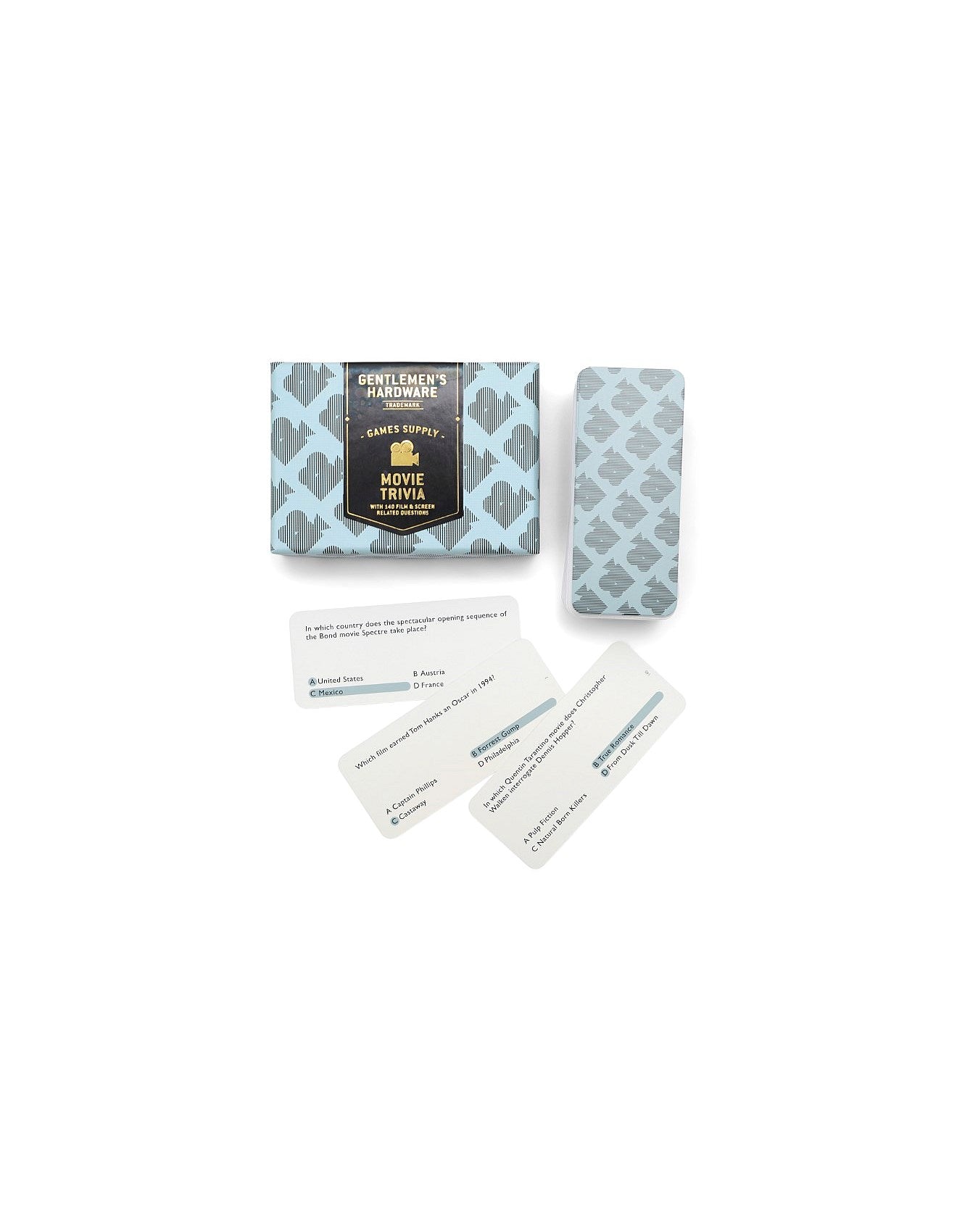 Roll out the red carpet for your newest game obsession, Movie Trivia! This trivia set features 140 different movie-related trivia questions, perfect for quizzing film fans. Set is packaged in a stylish box, perfect for display or stowing away.
