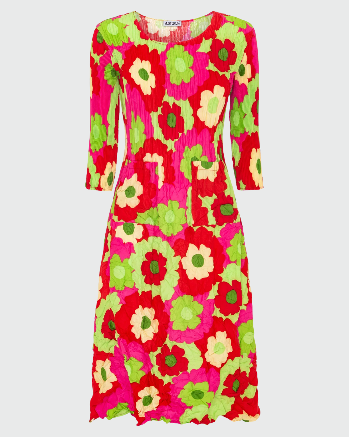 The Alquema 3/4 Sleeve Smash Pocket Dress is a timeless piece that combines artful design with everyday functionality. Designed for travel, with crushed pleats that always look chic. These unique pleats mean no ironing, just pack, unpack, and go. Its dynamic texture and stretch fabric contour and drape beautifully, enhancing every shape. The addition of 3/4 sleeves makes it suitable for year-round wear, transitioning seamlessly from casual outings to formal events.