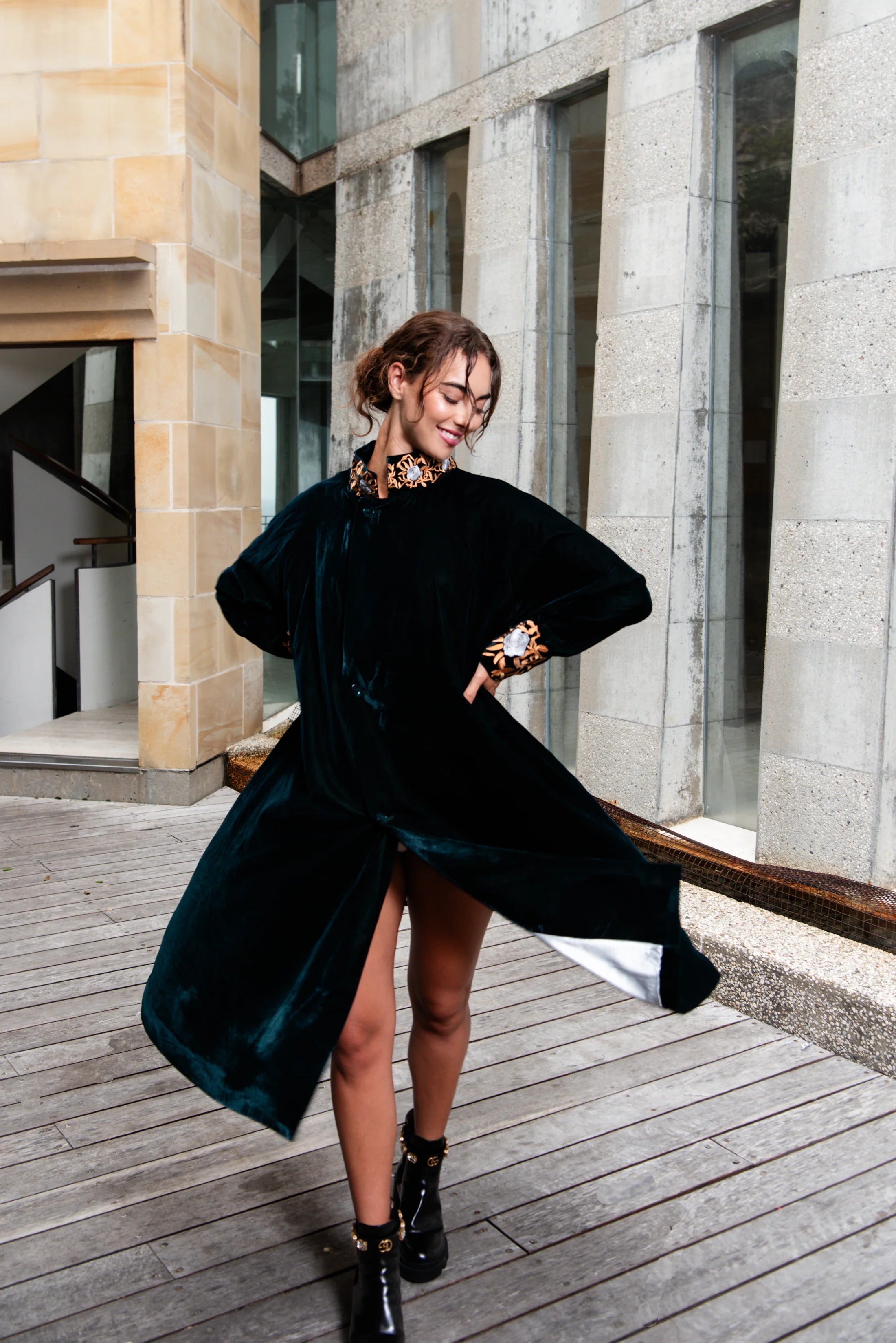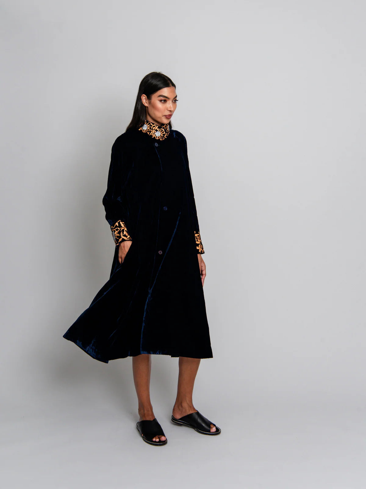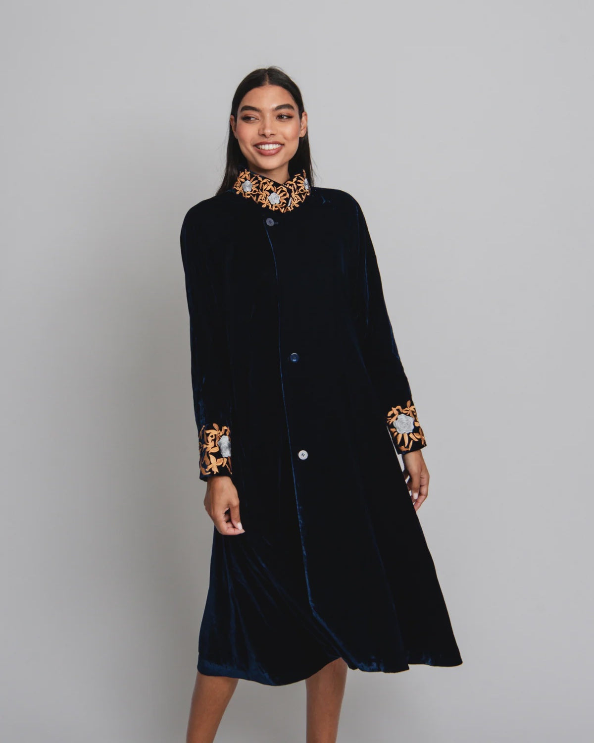 Daring and mysterious, the Velluto Coat is one of comfort and detail. With it's striking lining, and beautifully embroidered neckline and cuffs it hangs from the body with ease. Adorned with button closures, this coat will become your favourite to impress with.