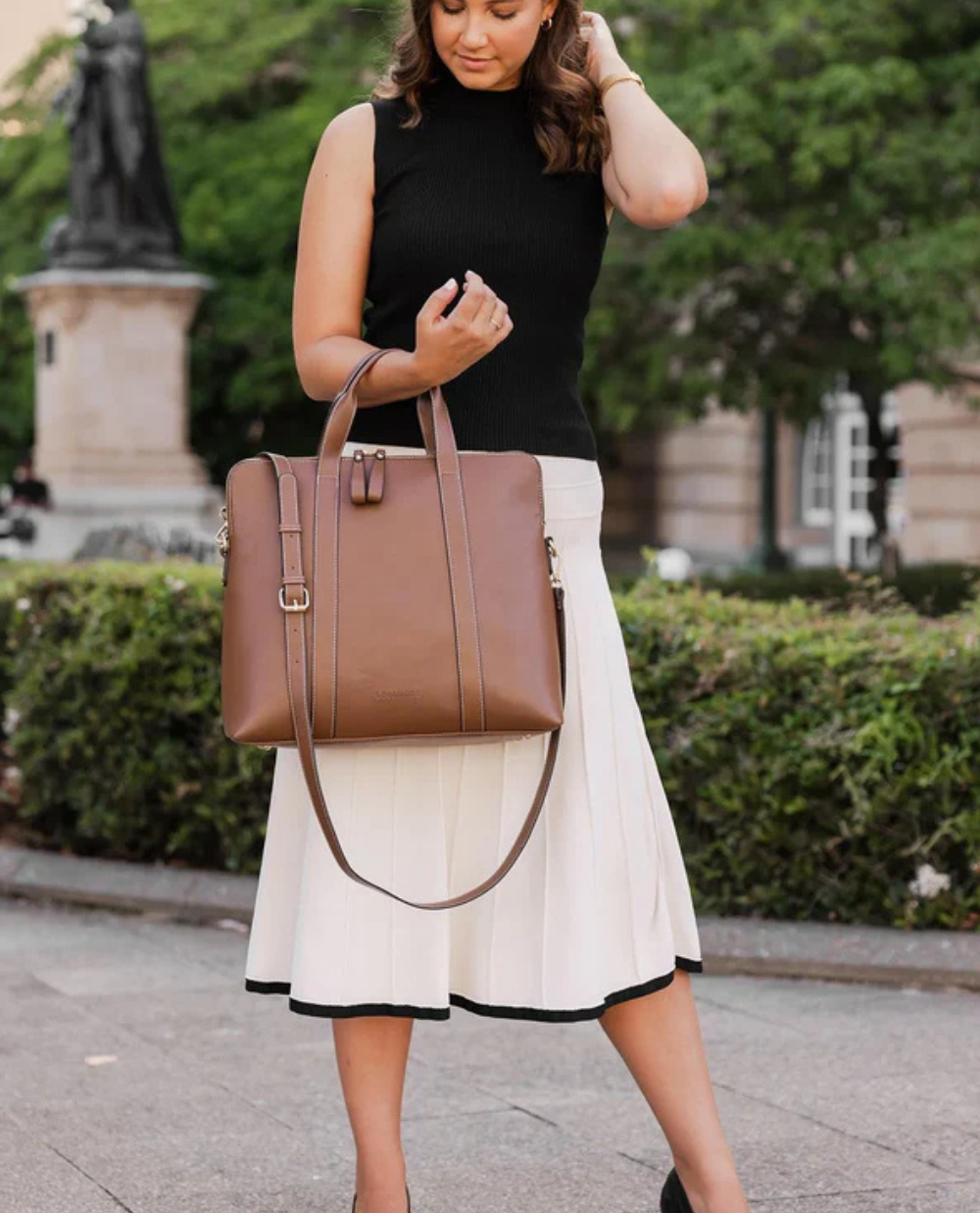 The Louenhide Rhodes Laptop Bag is a stylish, spacious work tote made from quality vegan leather. It fits up to a 15-inch laptop and has plenty of room for notebooks and essentials. The adjustable, detachable strap offers comfort, while the padded compartments protect your laptop or tablet.