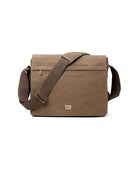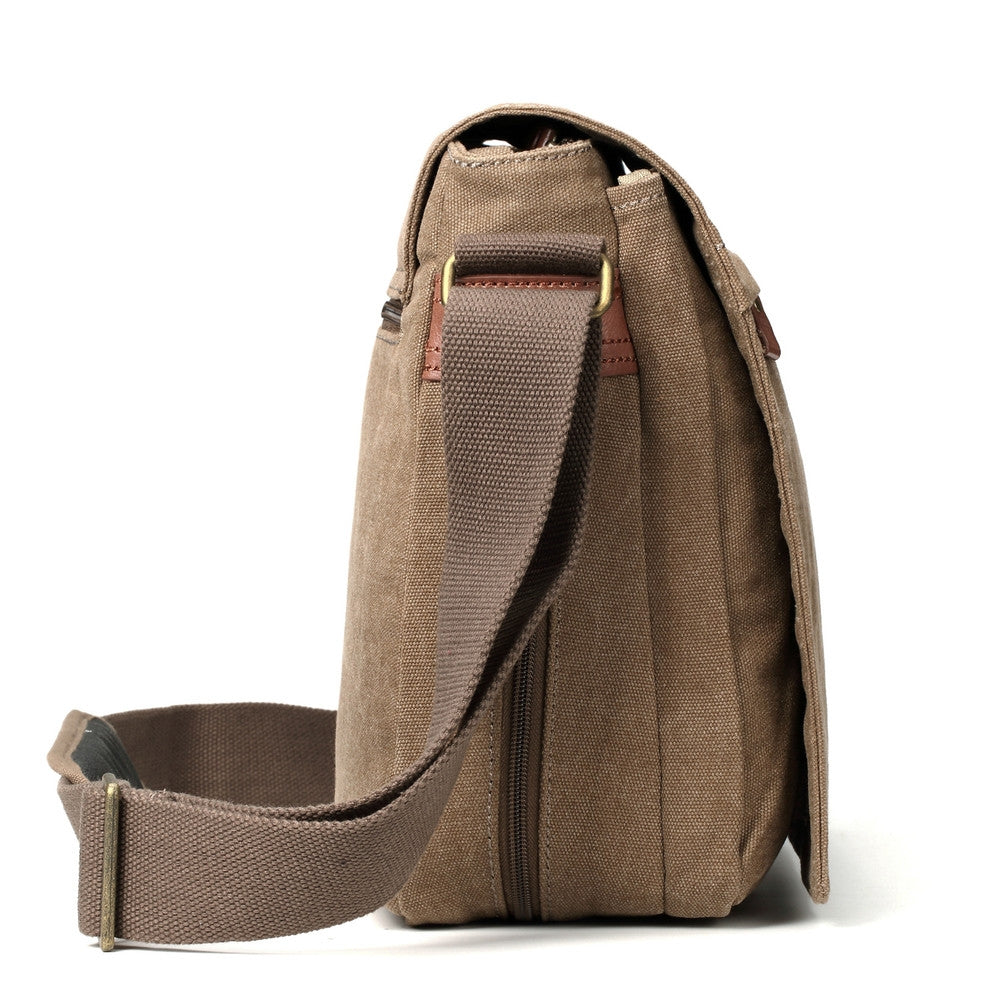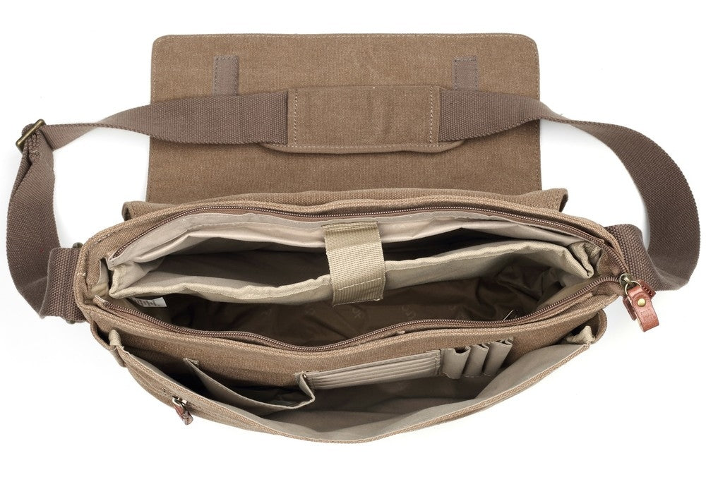 - Adjustable canvas shoulder strap with stylish and functional, brass plated buckles;