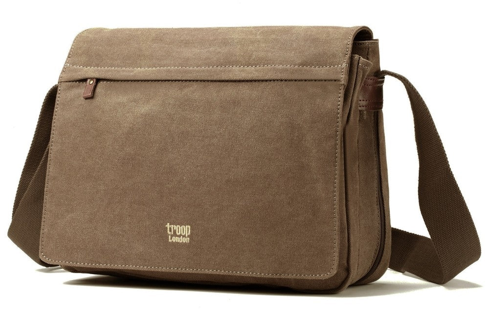 The Troop Classic Flap Front Laptop Messenger Bag offers a deep, packable main compartment with expanding base accompanied with spacious pockets. The padded laptop compartment is suitable to carry a laptop.