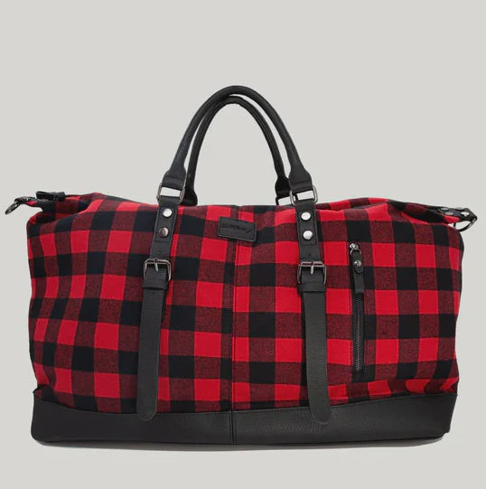 Introducing this delightful checkered holdall, perfect for a weekend getaway, road trip or Kiwi adventure. This trendy black & red canvas bag opens to reveal a roomy polyester lined inner. Vegan leather touches add softness and further style, with two external and one internal smaller zipped compartments for essentials.
