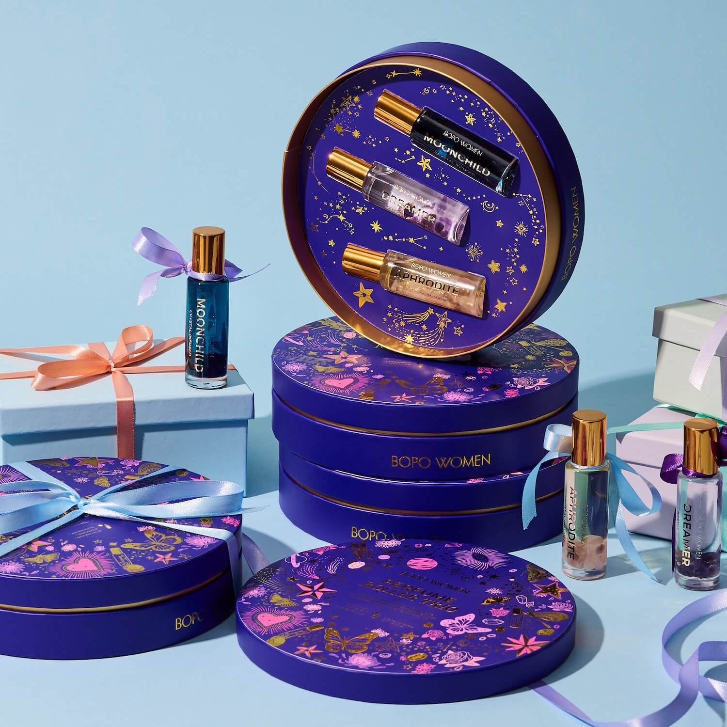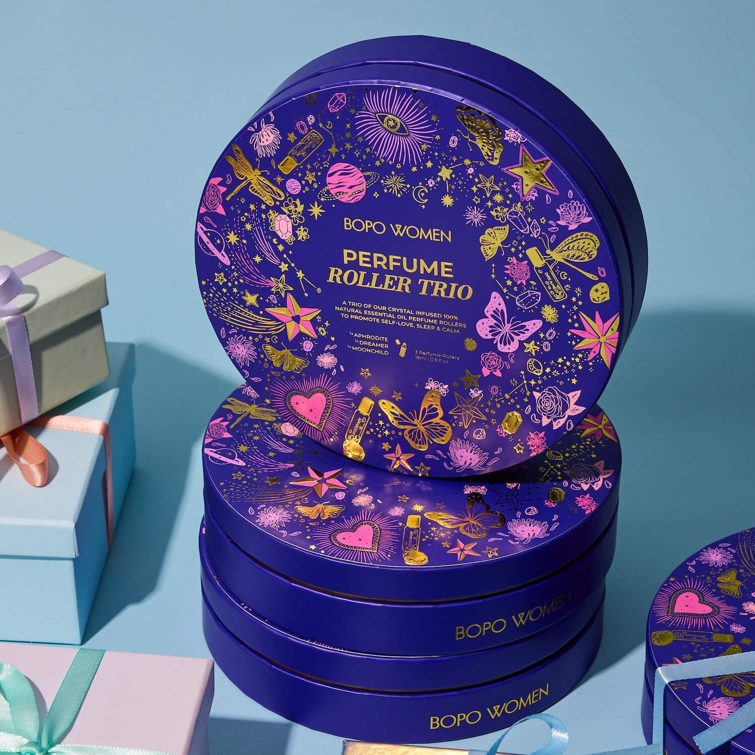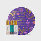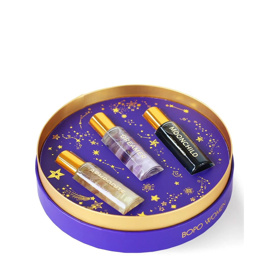 Three best-selling crystal infused essential oil perfume rollers, packaged in a beautiful gift box. These refined essential oil blends are amazing as a light natural perfume alternative and they're also the perfect gift for that special someone.
