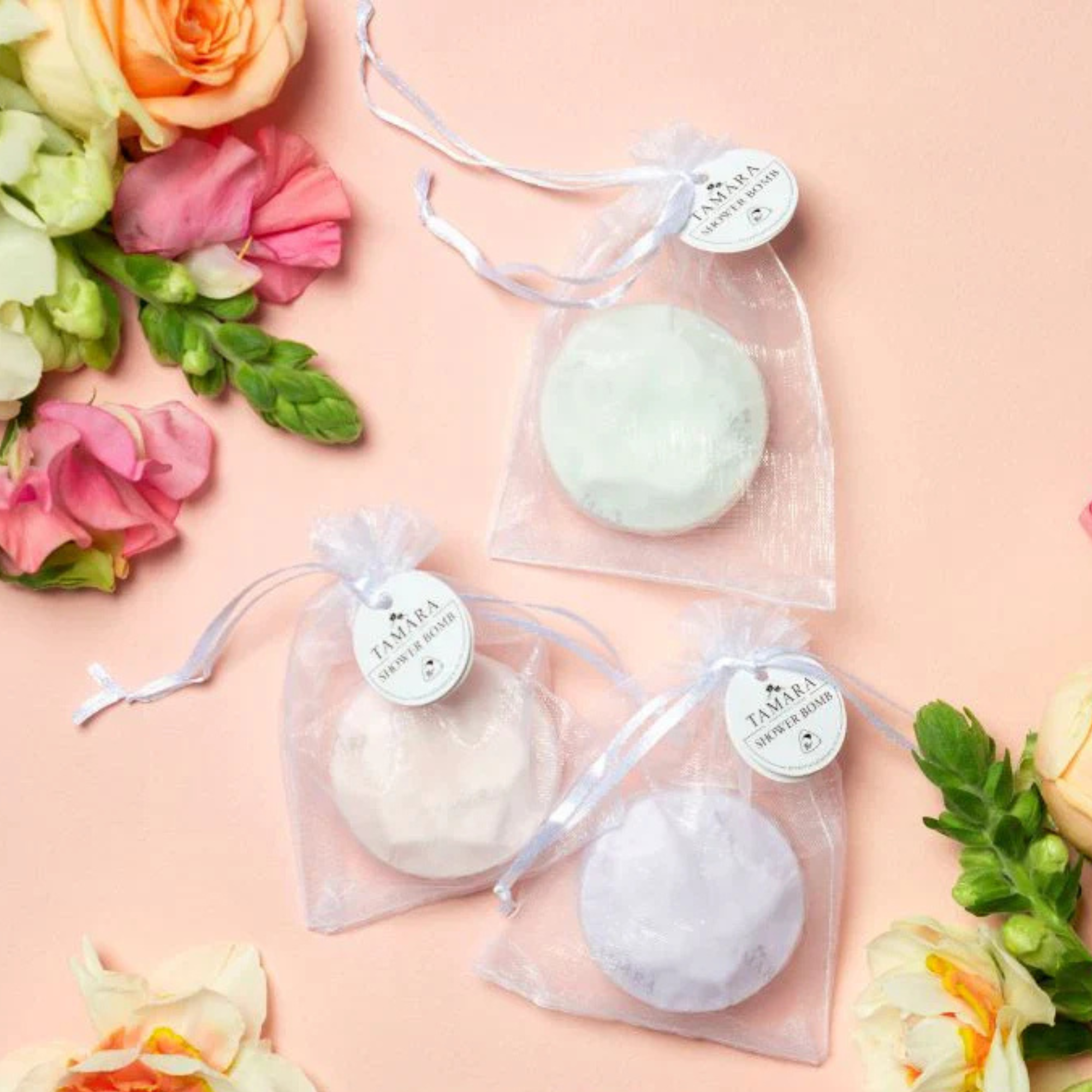These individual shower bombs are presented beautifully in an organza bag with a tag that has instructions and ingredients.