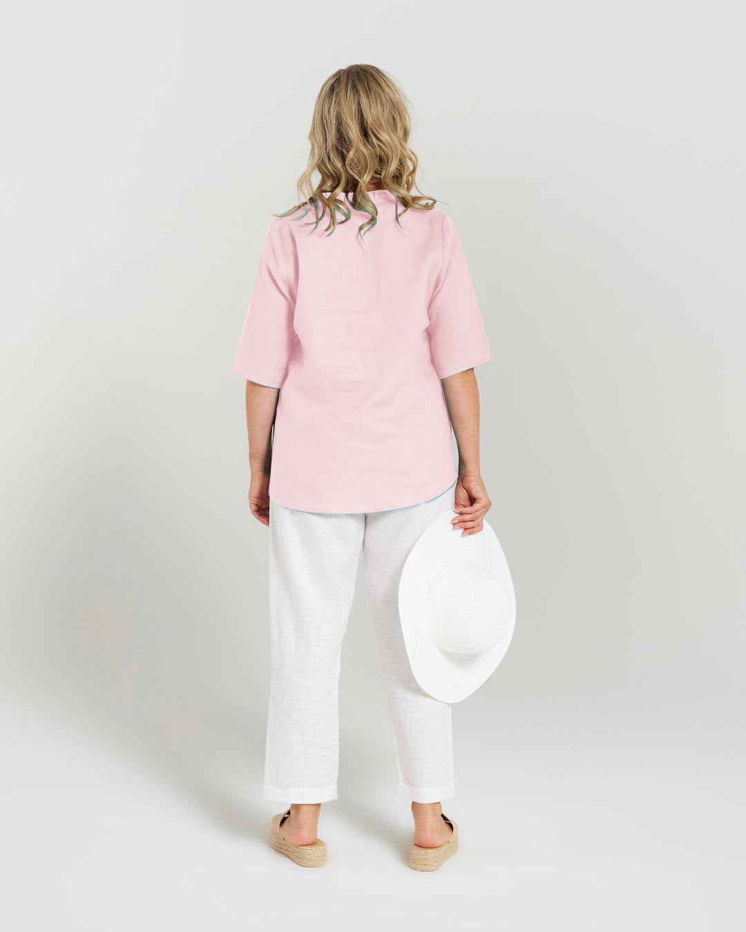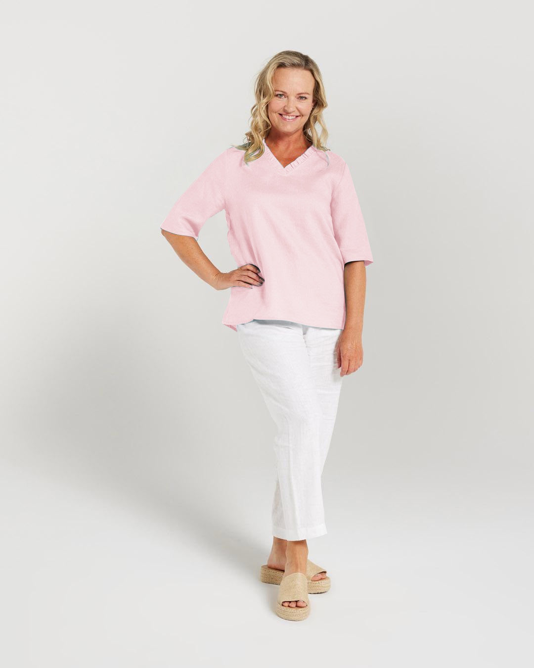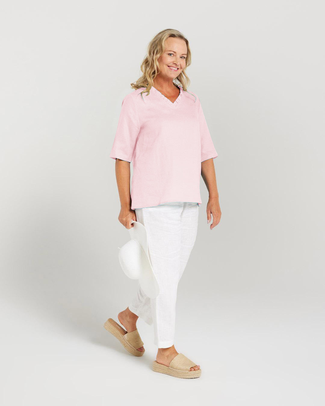 A beautiful linen V-neck top with a delicate gathered ruffle detail around the neckline. This top is the perfect addition to your wardrobe for effortless style and comfort.