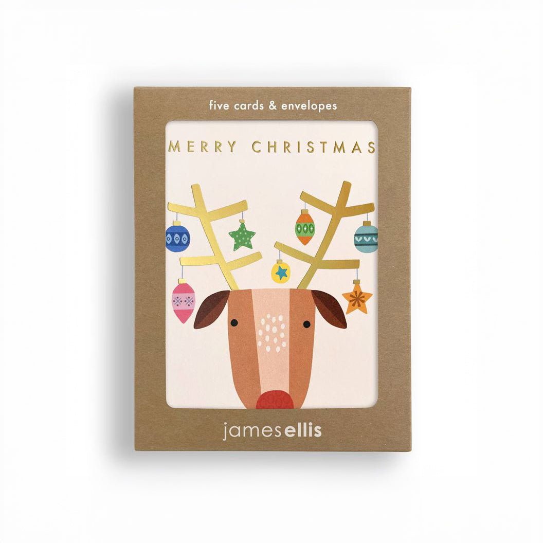 A mini Christmas card pack of 5 presented in a cardboard box of identical cards and envelopes. This card pack is plastic free and 100% recyclable.
