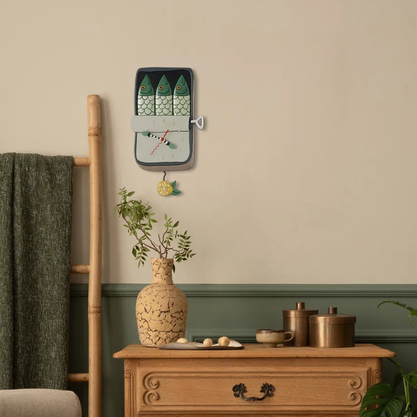 Add a splash of seaside charm with the Feeling Salty wall clock, shaped like a cheerful tin of smiling sardines. Featuring fish-shaped clock hands and a swinging lemon slice pendulum, this quirky timepiece is sure to reel in smiles!