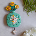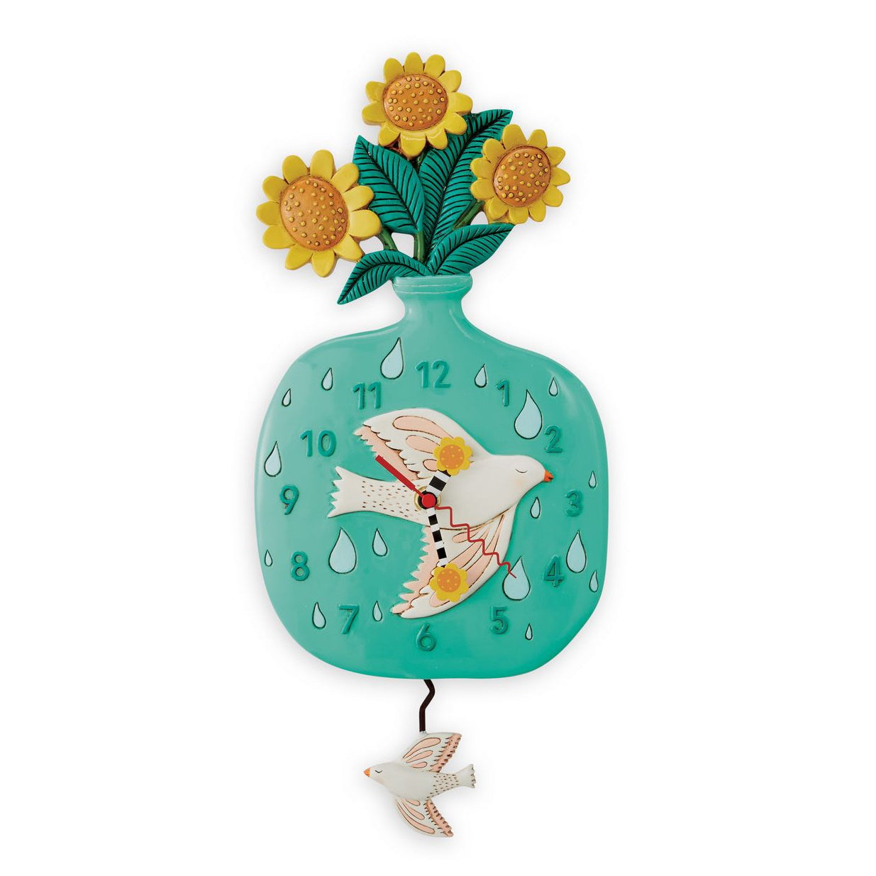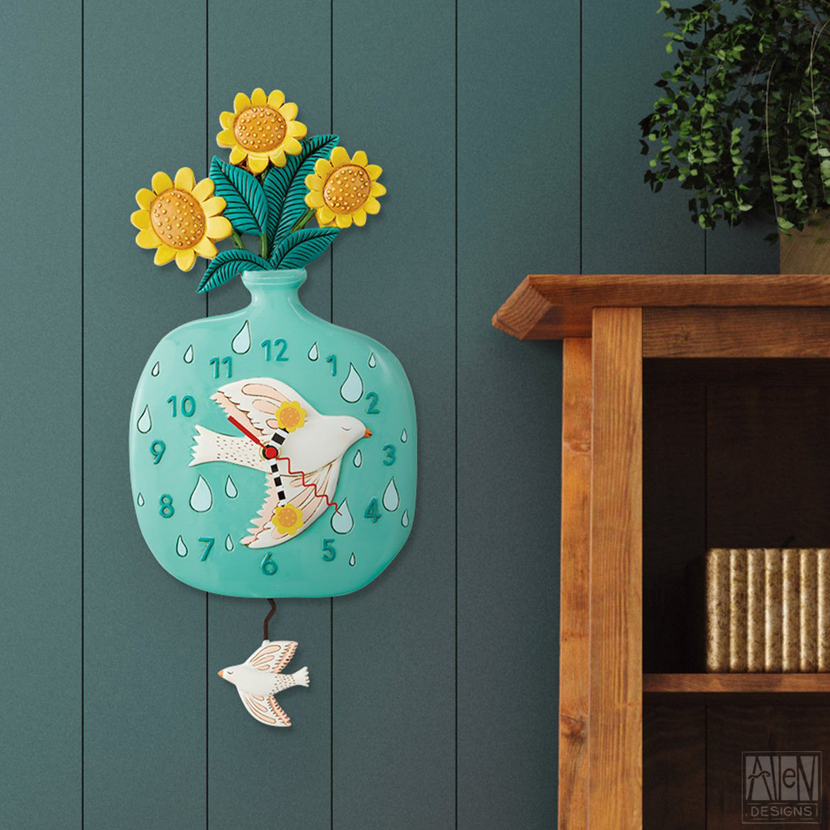 Peace and Sunshine wall clock with Pendulum. Features a dove flying through teardrops with sunflowers blooming above. A dove pendulum completes the clock.