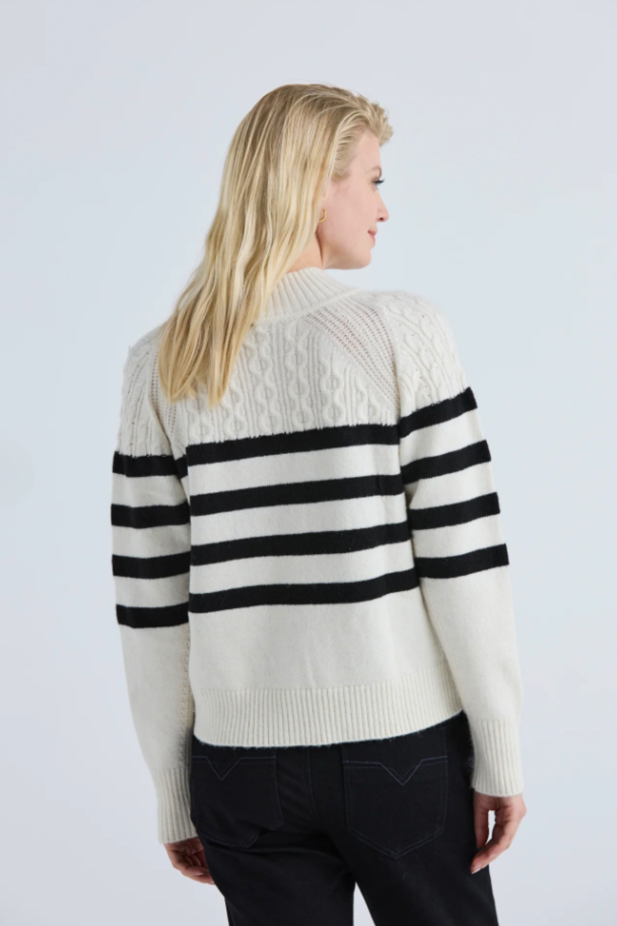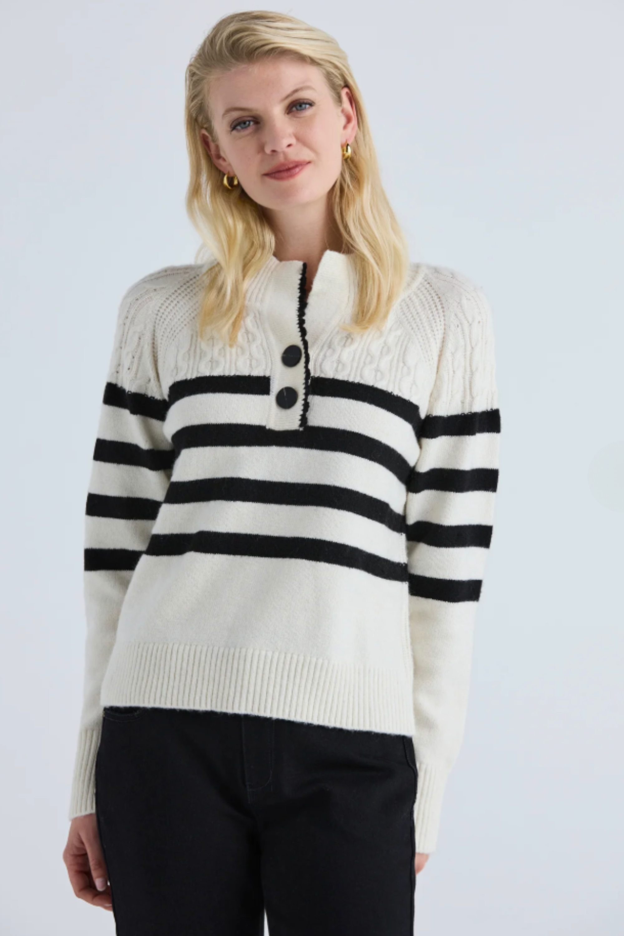The Hawke Sweater features a wool blend knit in ivory, showcasing a striking black placement stripe design. Key details include a front placket neckline with black crochet embroidery, horn-imitation buttons, and ribbed cuffs and hem, complemented by a cable and picot knit design on the upper body.