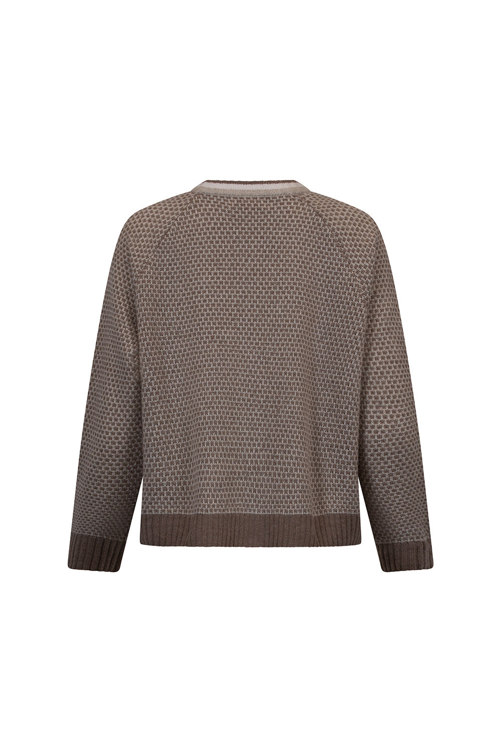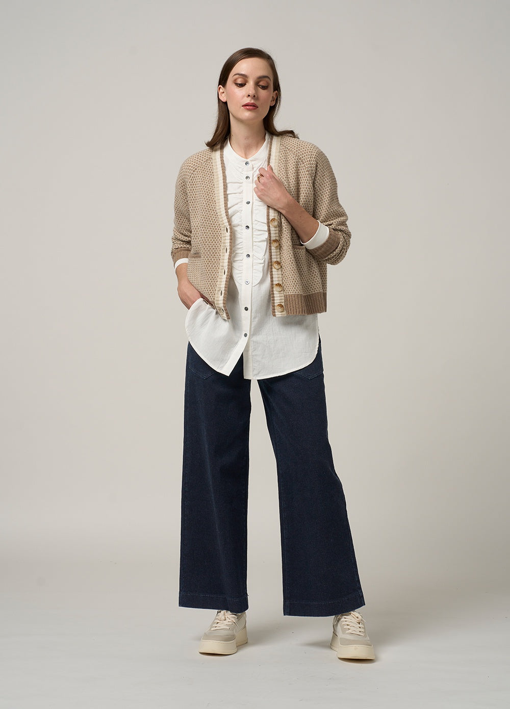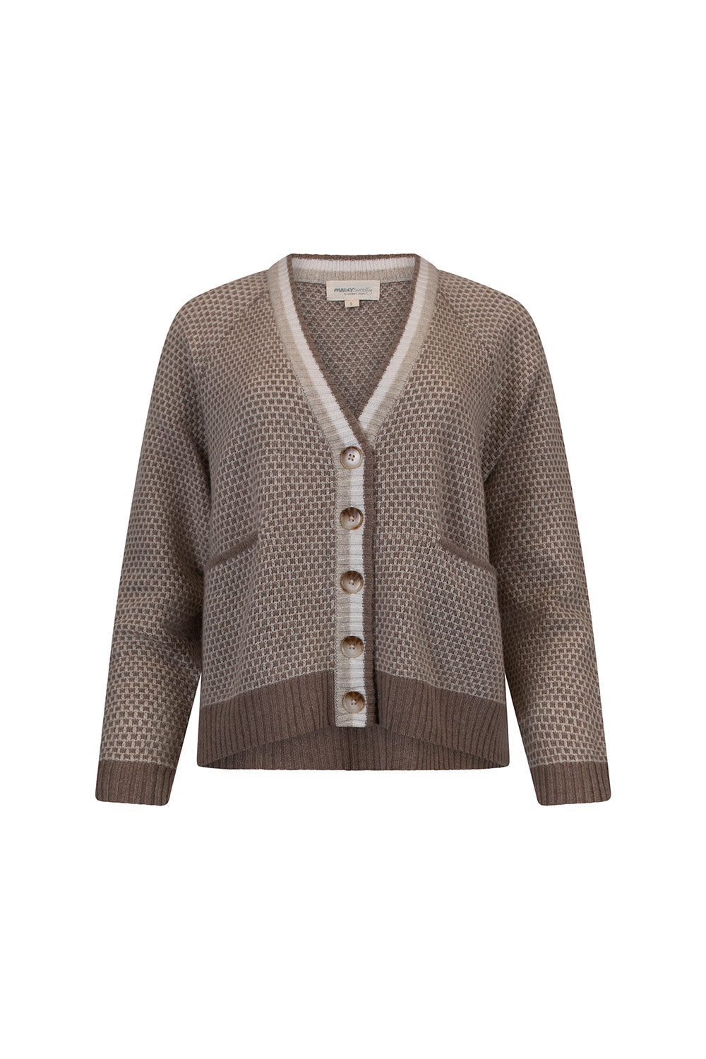 V-neck cardigan in a superfine merino wool blend, with a striped neck band and placket, featuring ribbing detail around pockets, cuffs and hem. Made with a two tone jacquard.