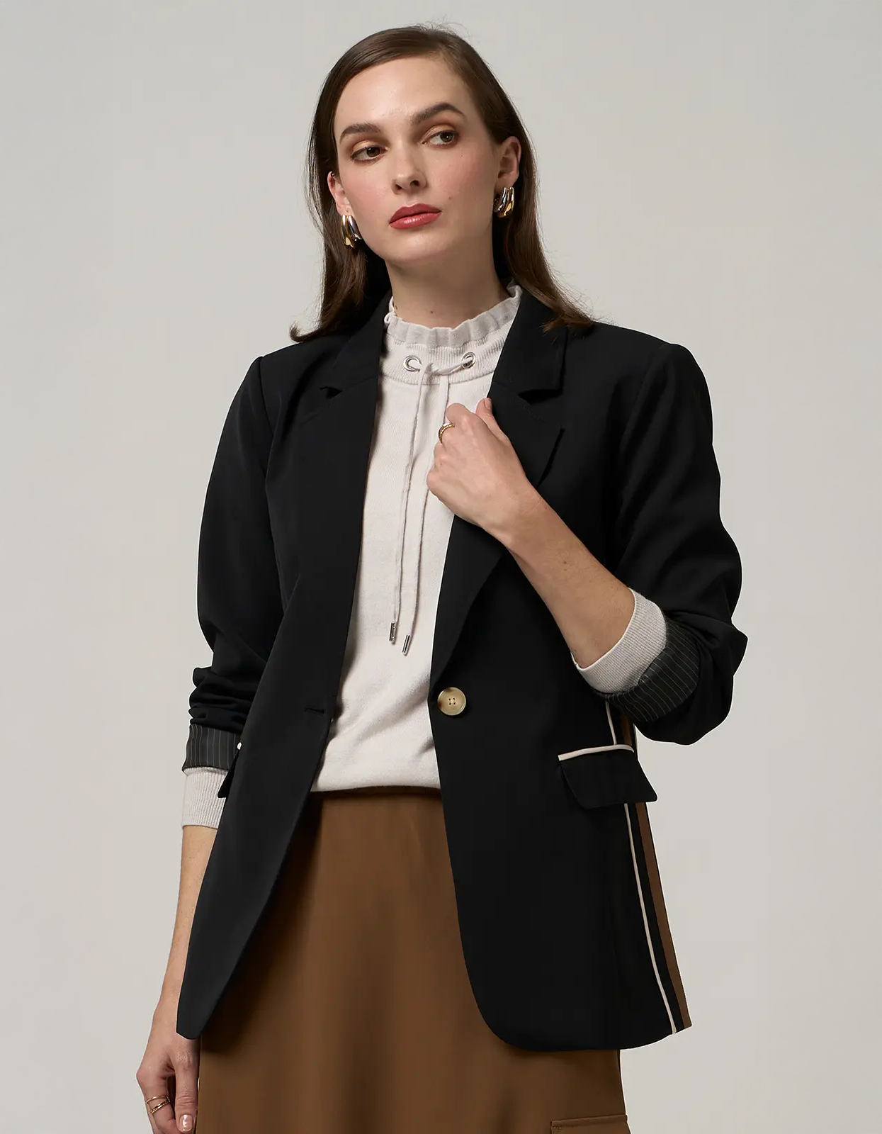 Classic double breasted tailored blazer with a squared hemline and back vent. Featuring contrast side panels and pocket details.