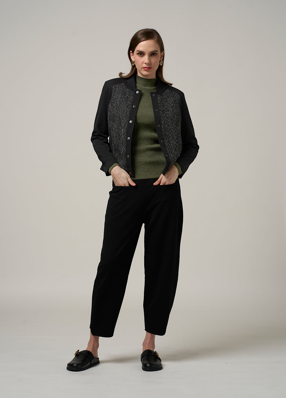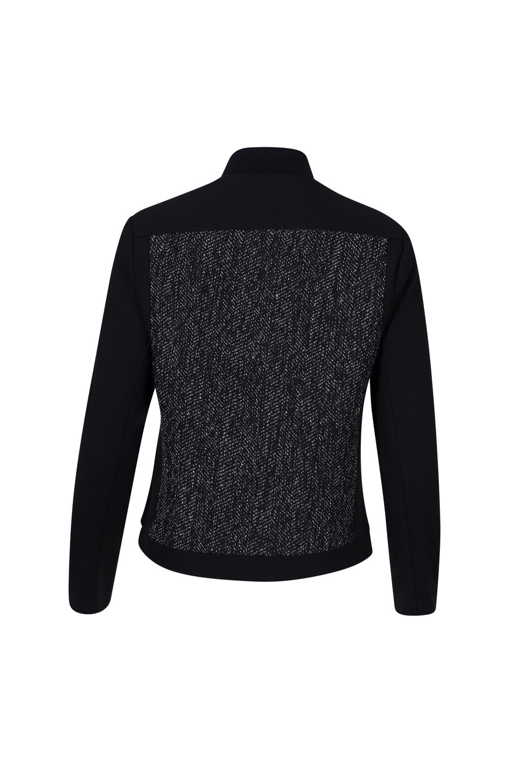 Slim fit ponte jacket, with a rib neckline, contrast wool blend panels, and dome closers. Fully lined.