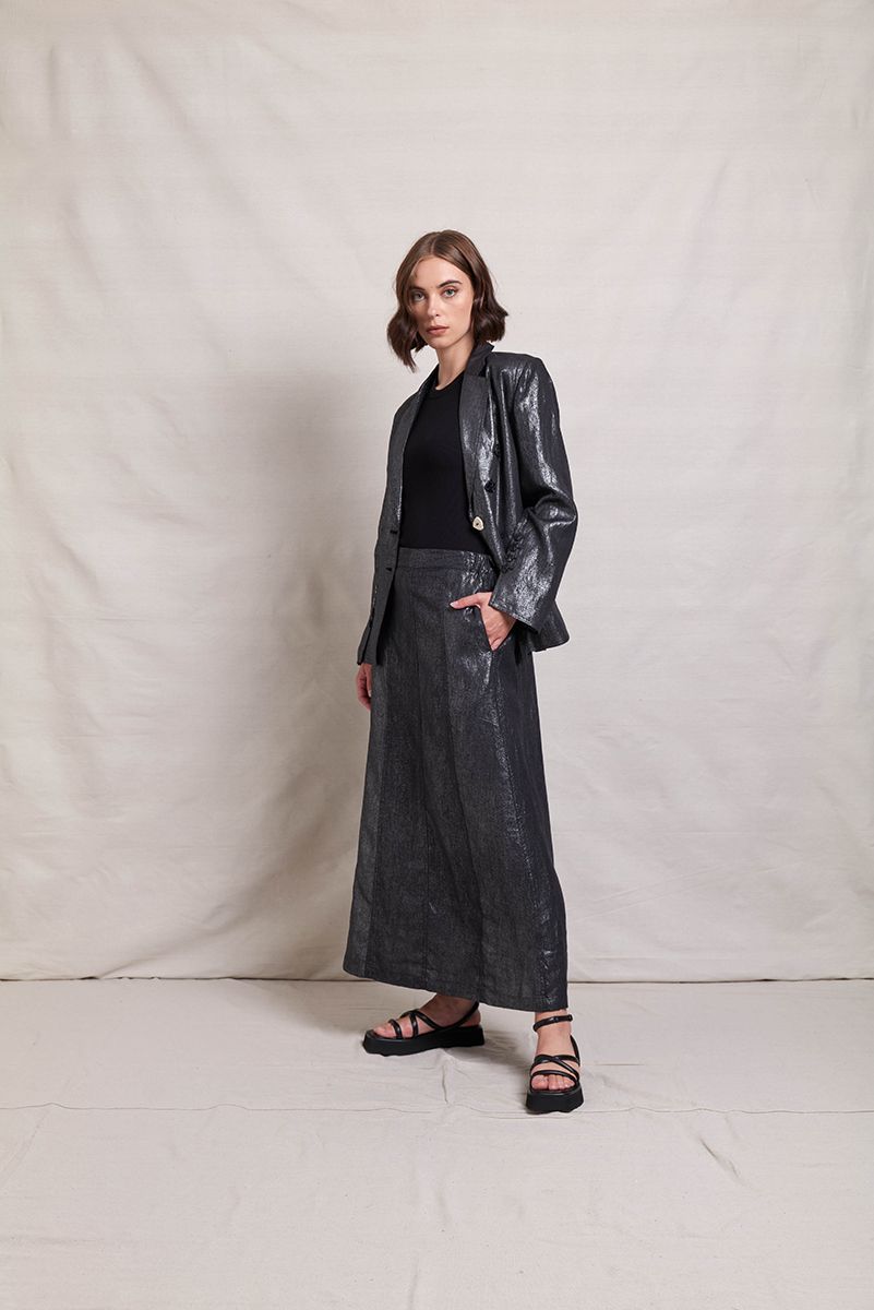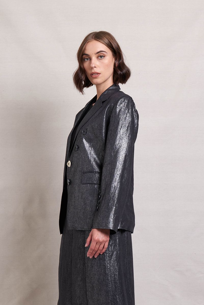 The In Ore Jacket by Neris is a relaxed blazer crafted from a linen with subtle shimmer throughout the fabric. This elevated style features mottled mismatched buttons that do up the front and buttons on the cuff, it has two front pockets an open lapel and is fully lined. An ideal piece to elevate everyday dressing or blazer for a special event.