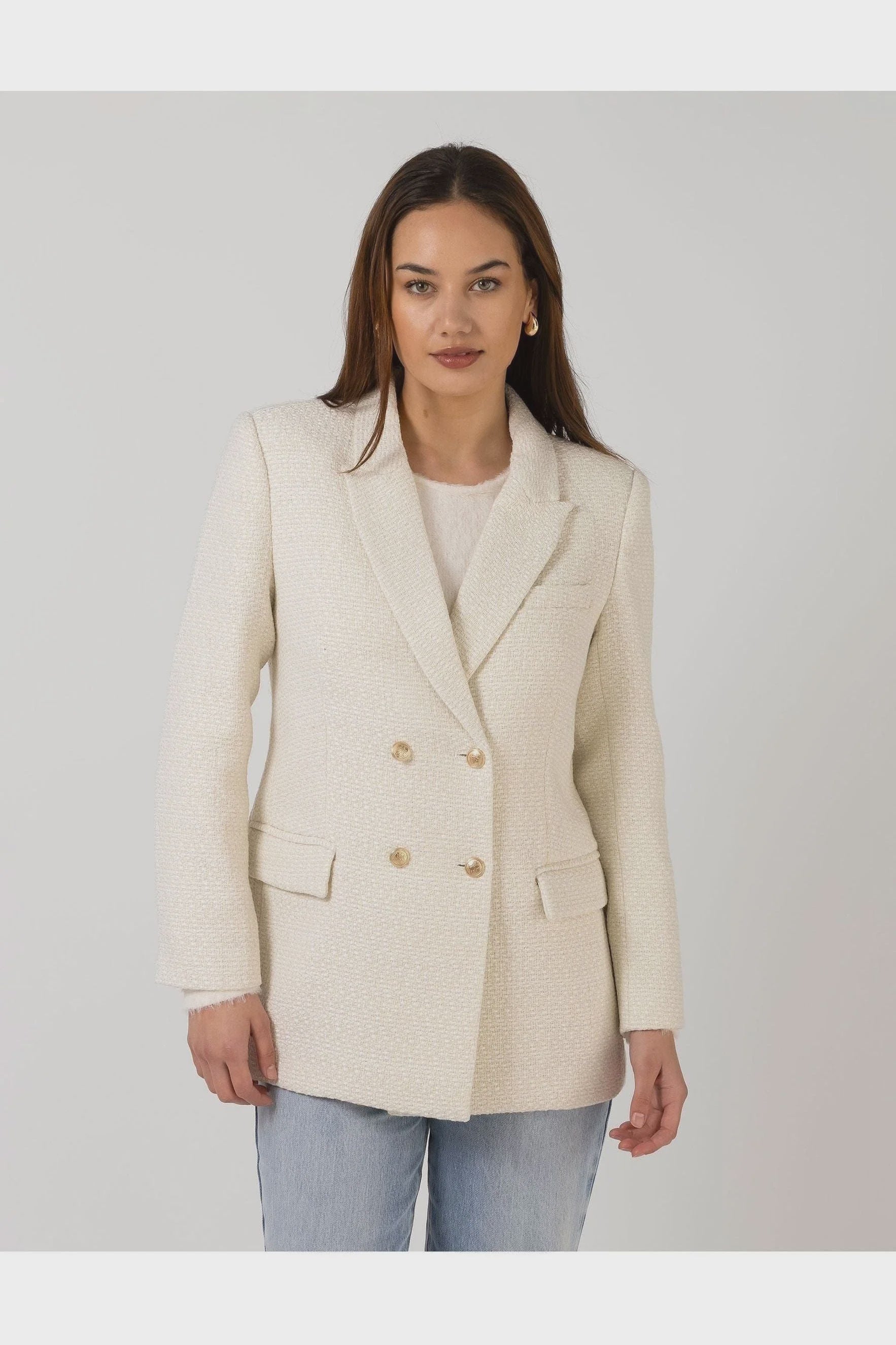 A pearl-colored blazer with gold buttons to go with everything in your wardrobe. The texture adds depth and interest while the double-breasted style adds a structured, sophisticated touch, and the collar elevates it even more. It will pair well with a pretty skirt/dress or go casual with denim.