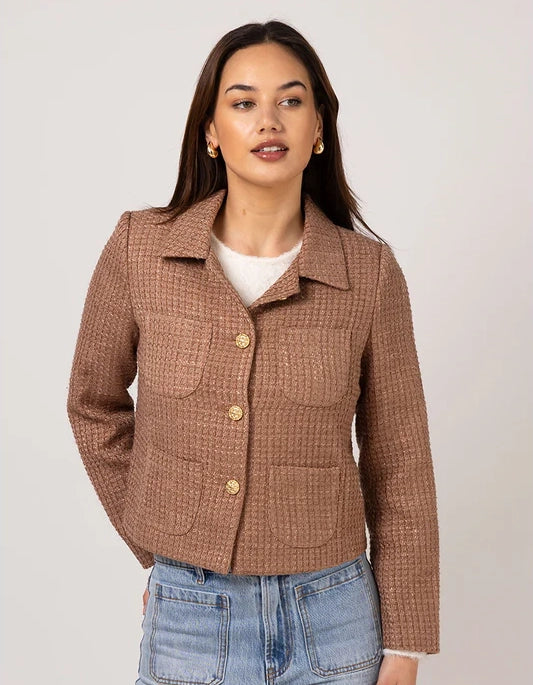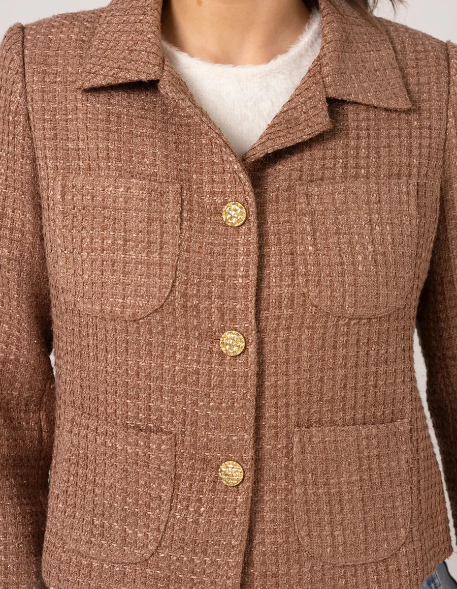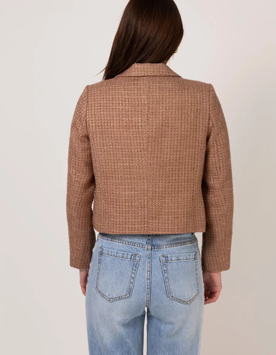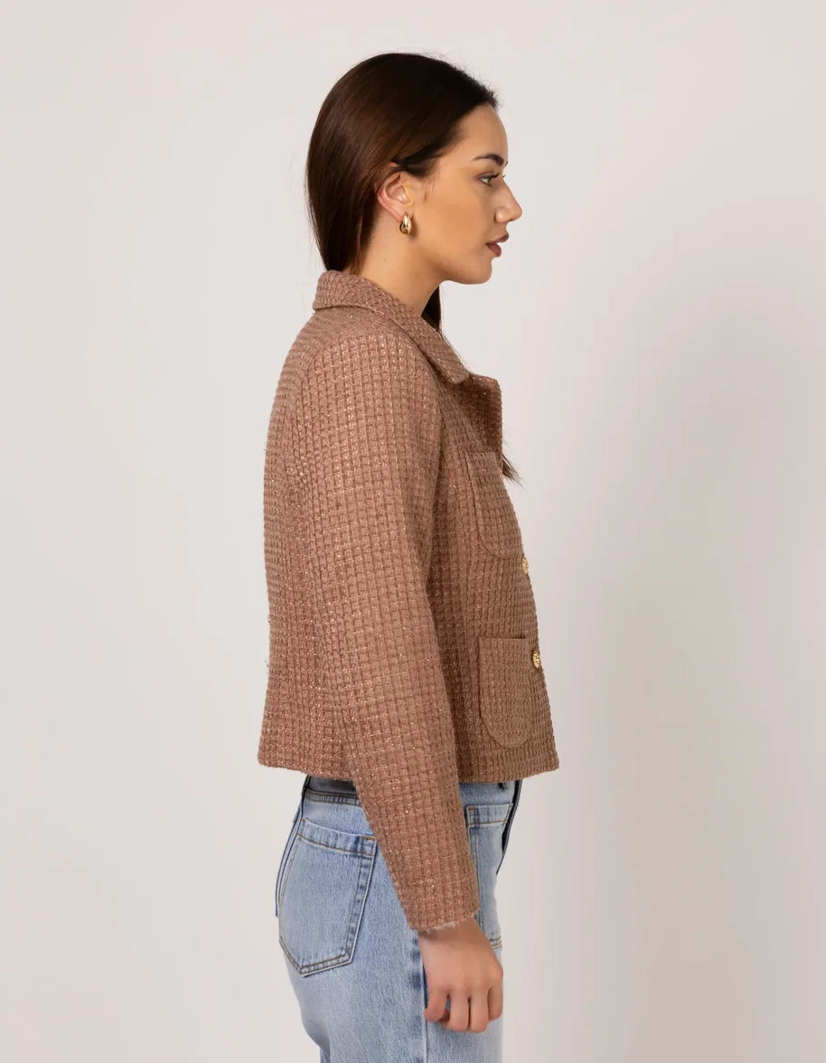 The Stella + Gemma Pandora Jacket in Rose Dust combines sophisticated tailoring with a touch of shimmer. Crafted from a blend of materials, this structured jacket features luxe gold buttons and a hint of lurex thread woven throughout, adding a subtle gleam to your ensemble. Perfect for elevating both professional and evening outfits.