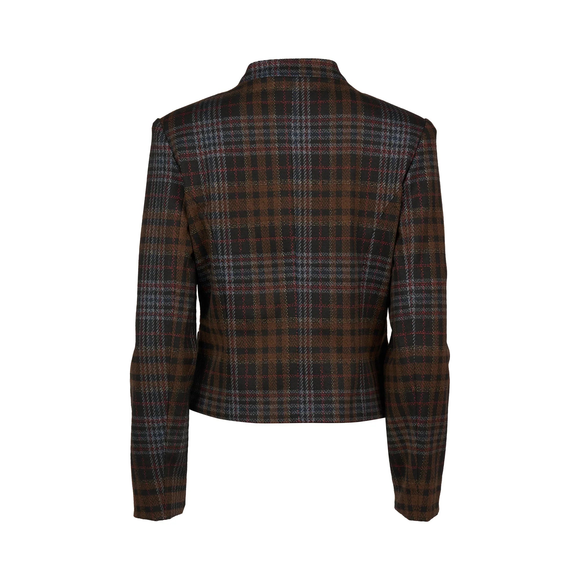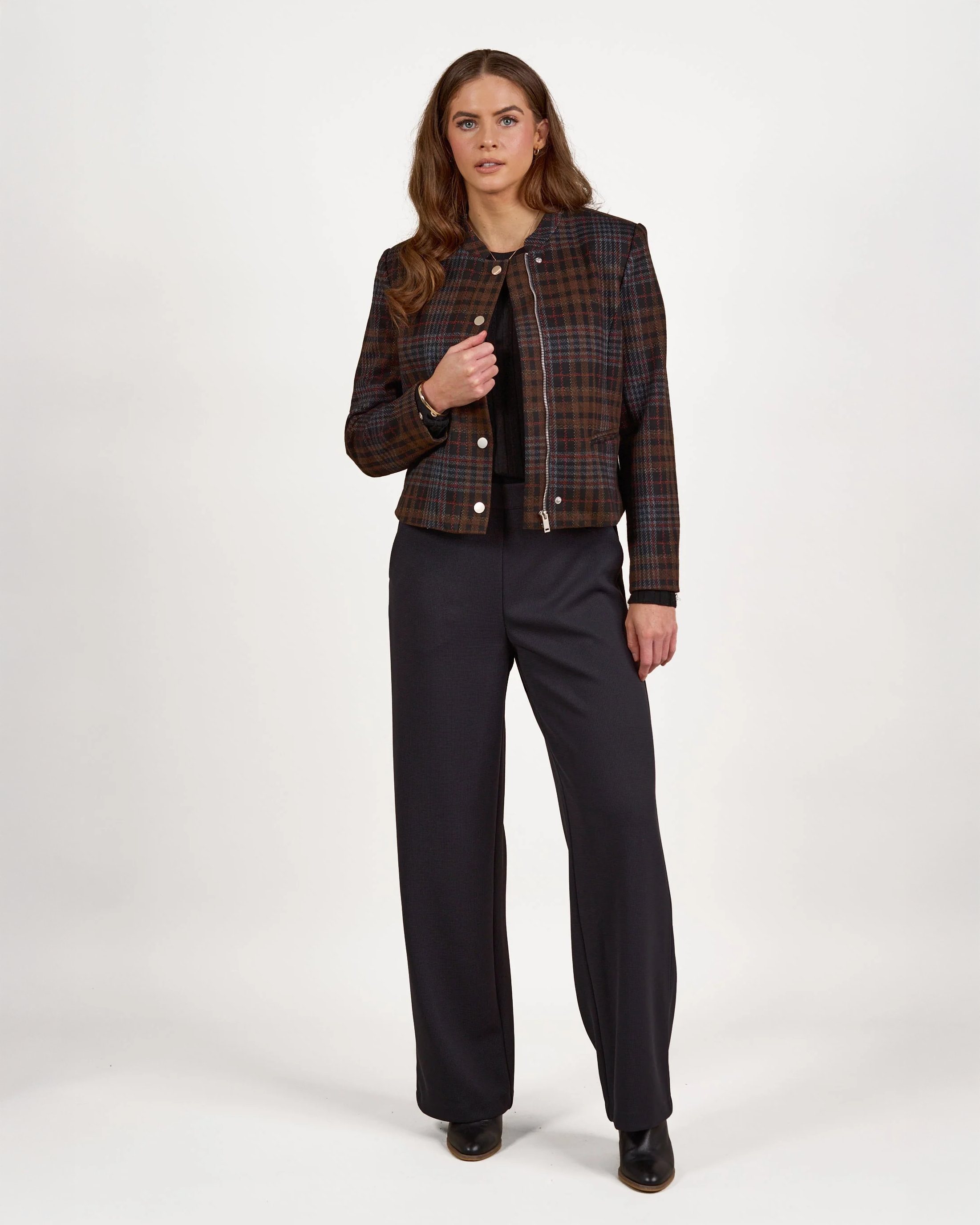 - Mandarin collar with concealed placket featuring metal zip and dome button closure