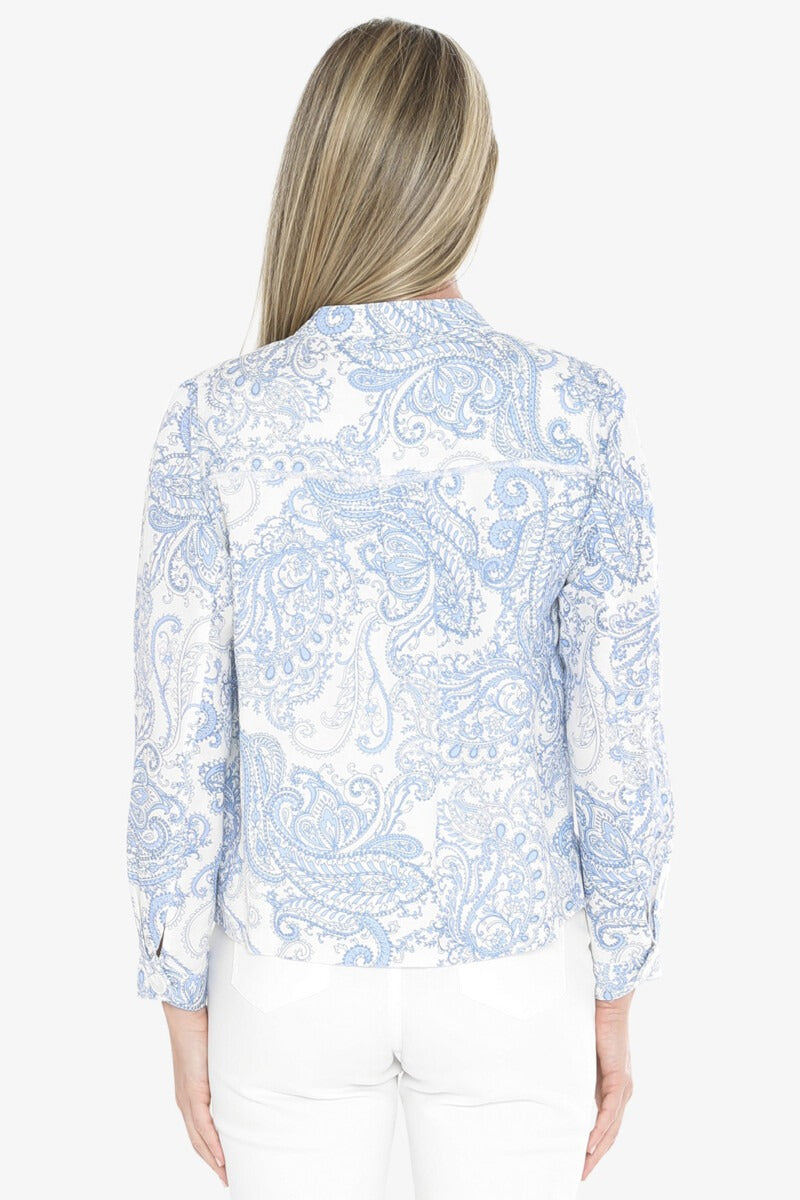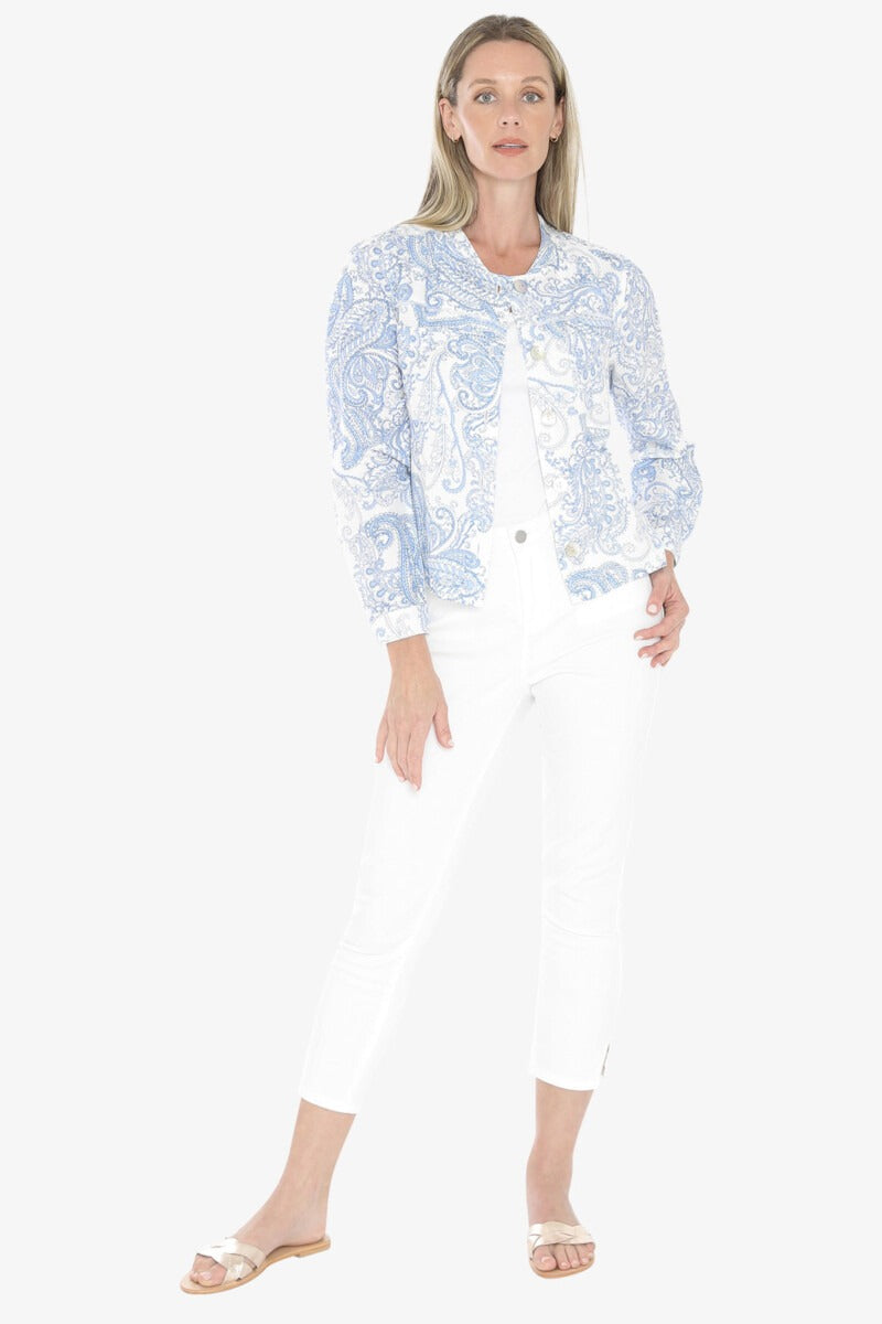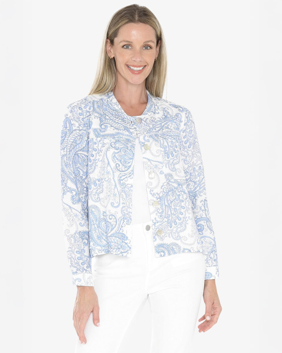 Elevate your wardrobe this season with the new Paisley Print Mykonos Jacket. A long sleeve style, two pocket, shell buttons and crew neck. Linen Viscose Blend.