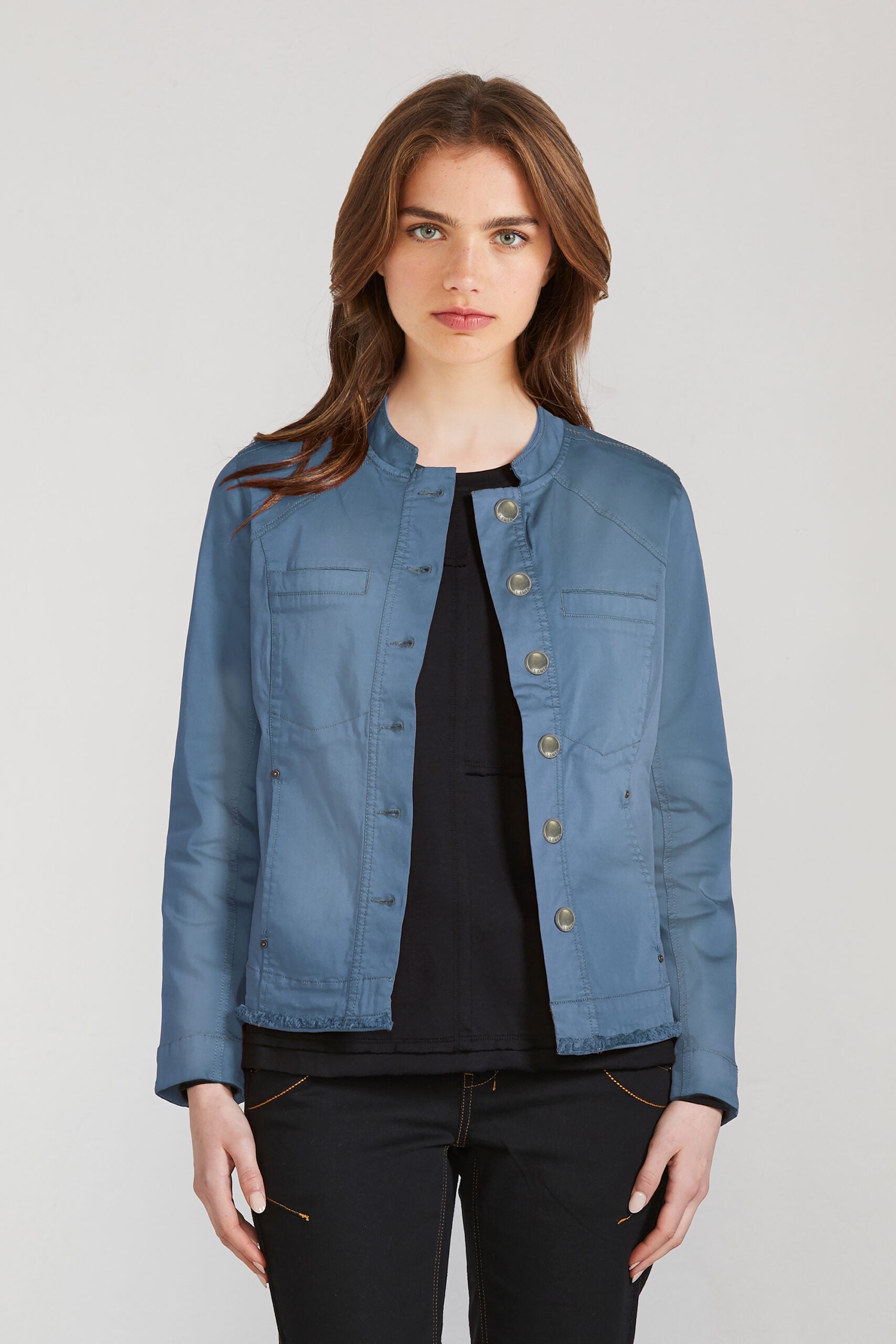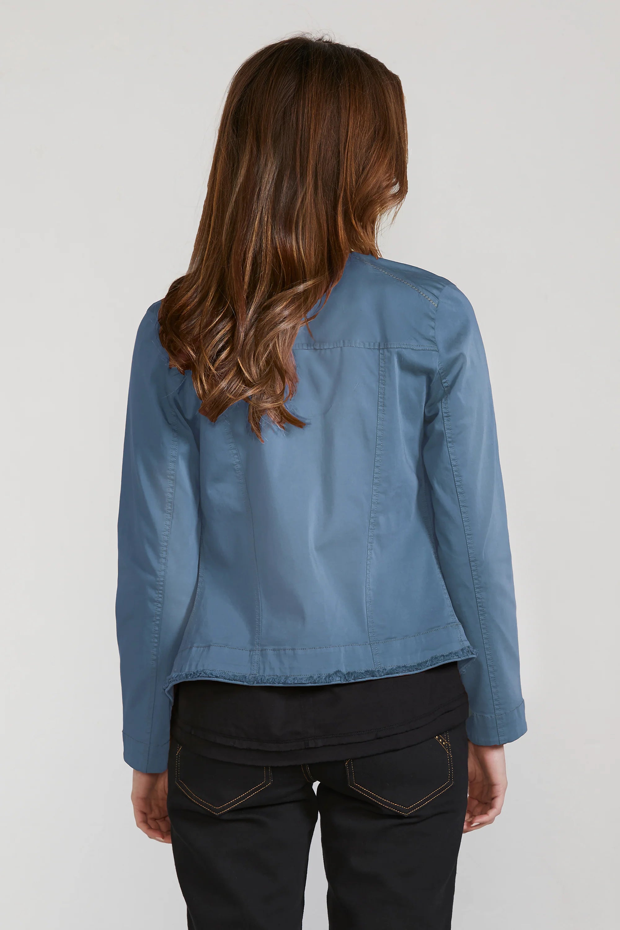 The Flint Jacket in a soft stretch cotton modal is perfect for cooler days or evenings. Designed with a frayed hem finish and heavy topstitch at yoke seams to enhance this classic wardrobe staple. This style is garment dyed to achieve a distressed look and soft hand feel.