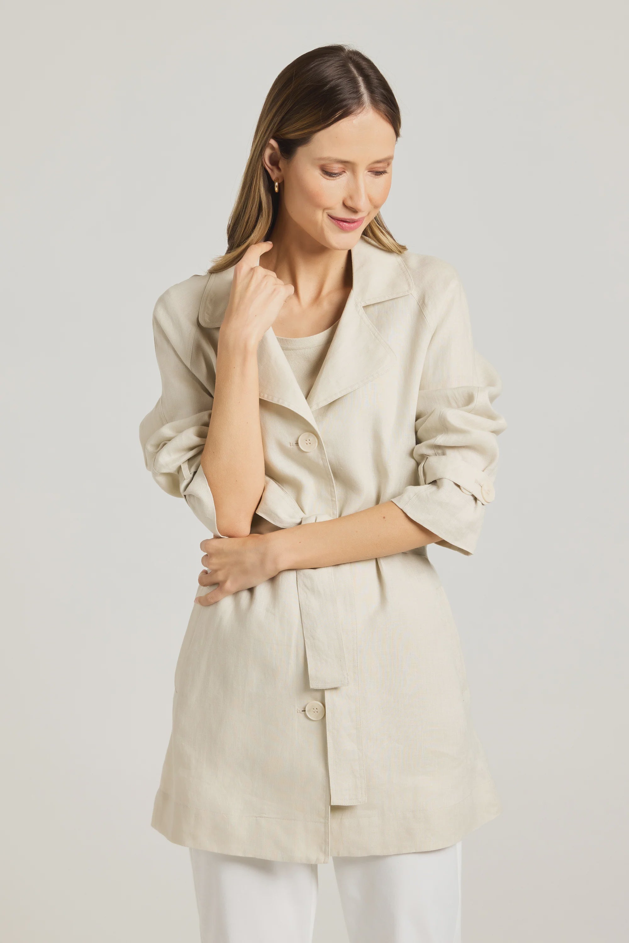 This modern trench coat, made from 100% linen, is perfect for a stylish, on-the-go look. It features a wide collar, wide lapels, and hits thigh length for a trendy vibe. With long raglan sleeves, cuff straps, waist ties, and front buttons, it's both functional and chic. Pair it with a white tank top and ankle-length wide-leg pants for a fresh look, or layer with colorful pieces for a fun twist this season!