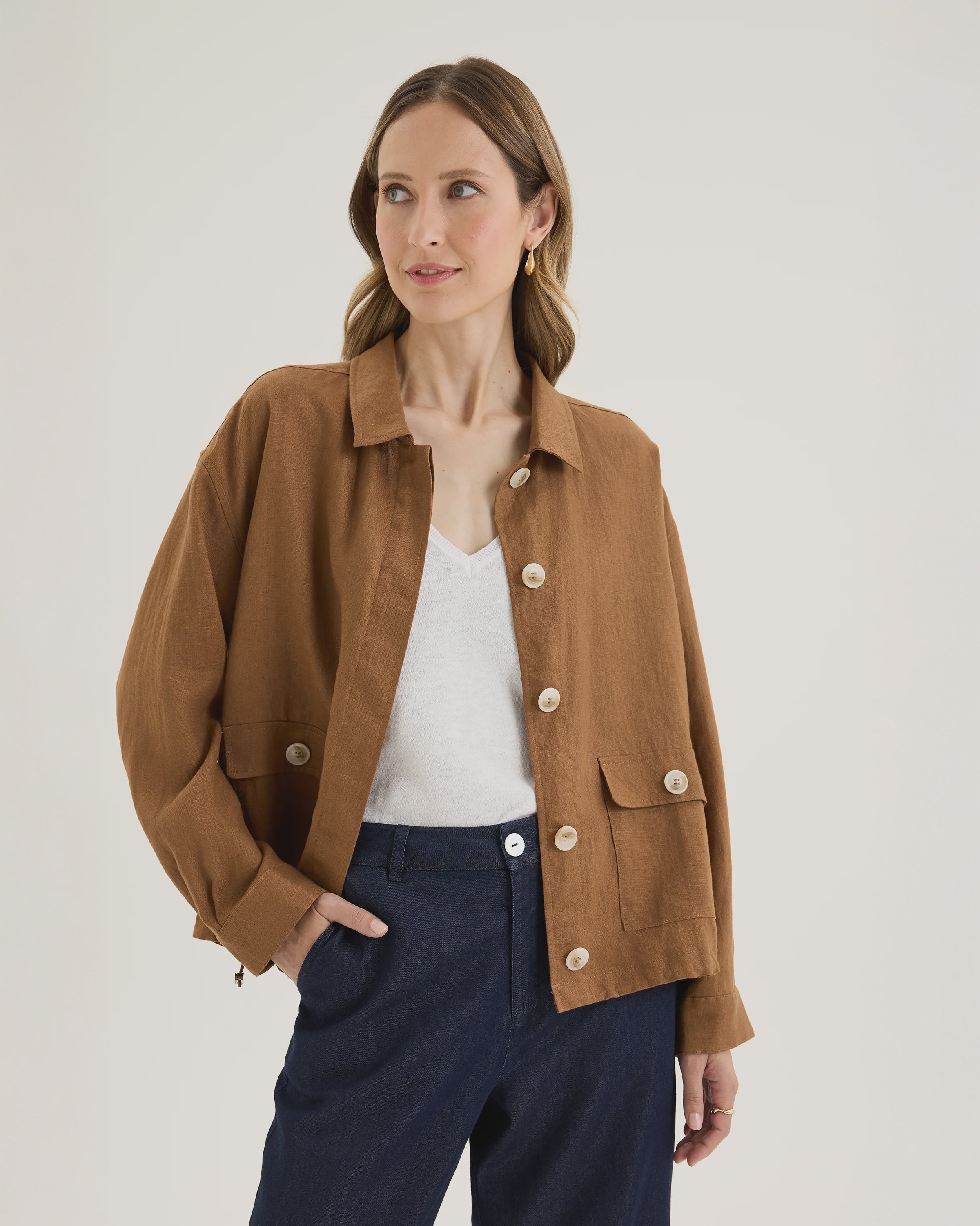 The Tirari Bomber is a relaxed take on outerwear, made from 100% premium European Flax linen. It offers the ease of a shirt with the subtle structure of a lightweight jacket. The boxy silhouette features a collar that can be worn two ways: folded down like a traditional shirt collar, or standing up for a more structured look. At the waist, the elasticated drawcord hem with toggles adds shape and styling versatility. Long sleeves with button cuffs and functional flap pockets bring practical detail, while the concealed button-through front balances the softness of linen with everyday utility.
