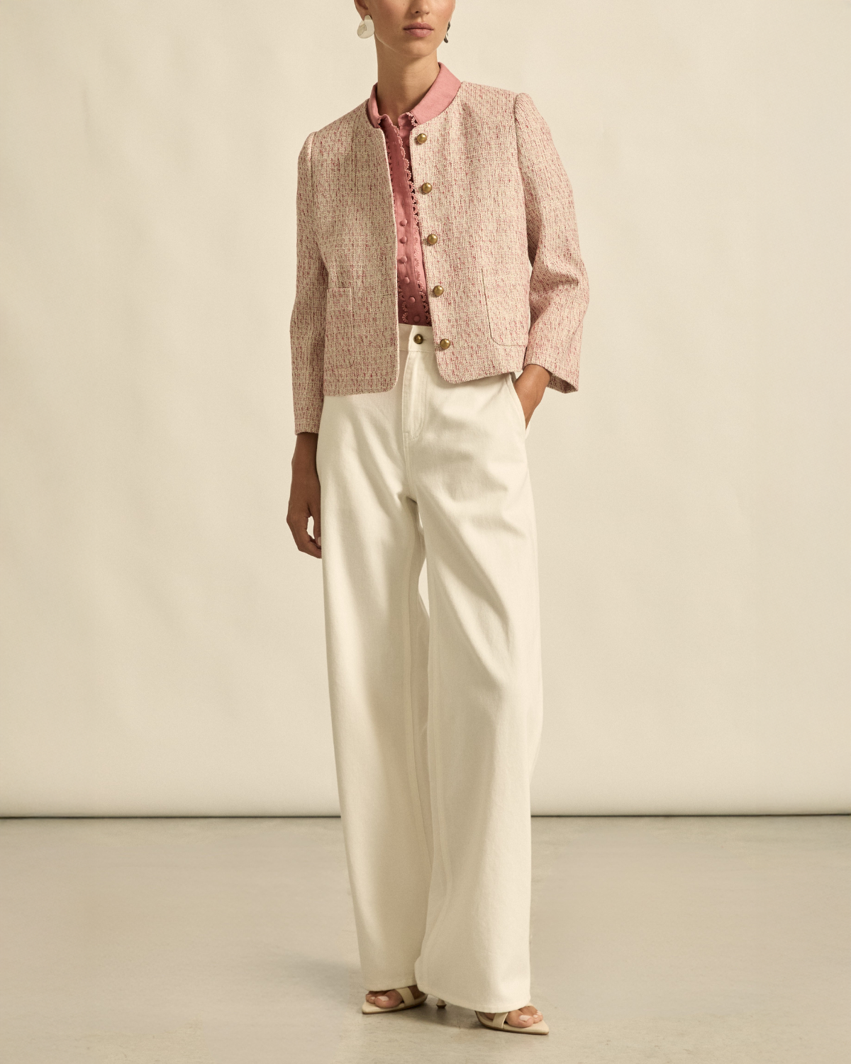 A romantic take on tailoring. this summer-weight boucle jacket pairs nostalgic charm with a modern silhouette, offering polish with personality. Inspired by vintage hues and timeless silhouettes, the dash jacket in strawberry delivers an effortless blend of femininity and edge. Perfect for pairing with florals or crisp separates. Finished with rounded off front pockets and full stretch lining for all-day comfort.