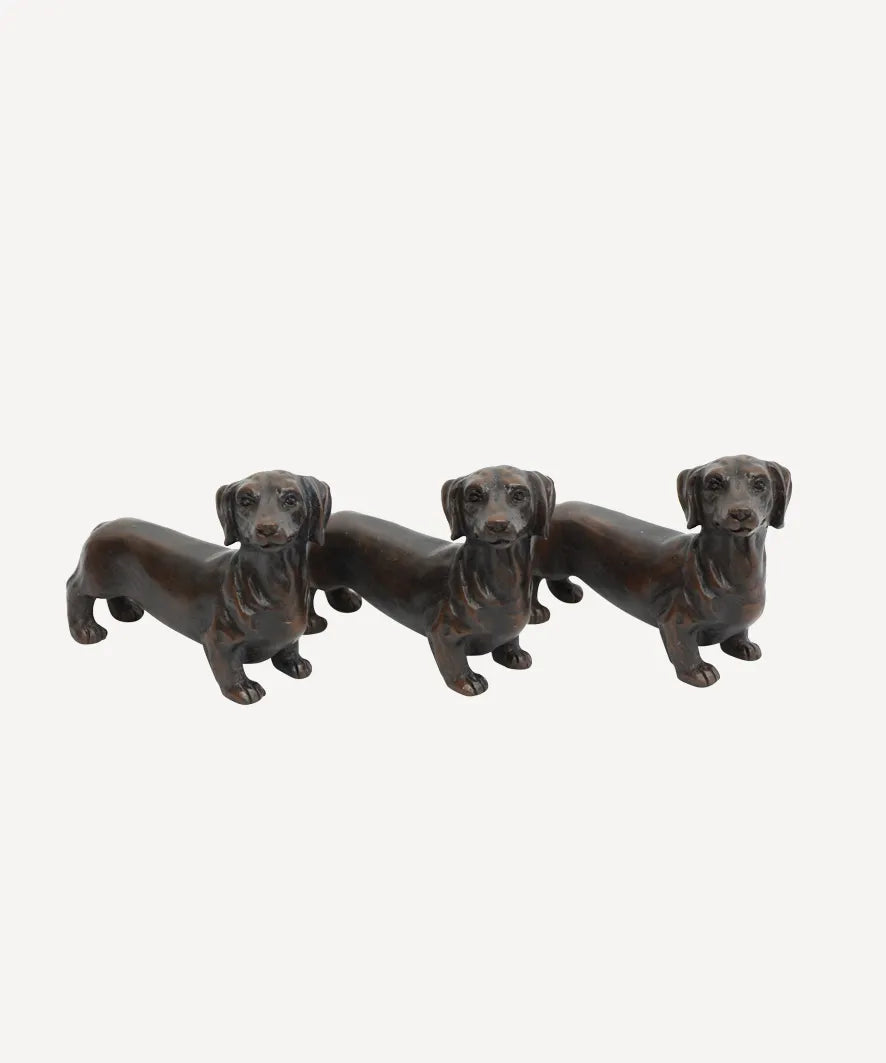 • Featured: Three resin Dachshund dogs to use as a pot stand or as individual ornaments.