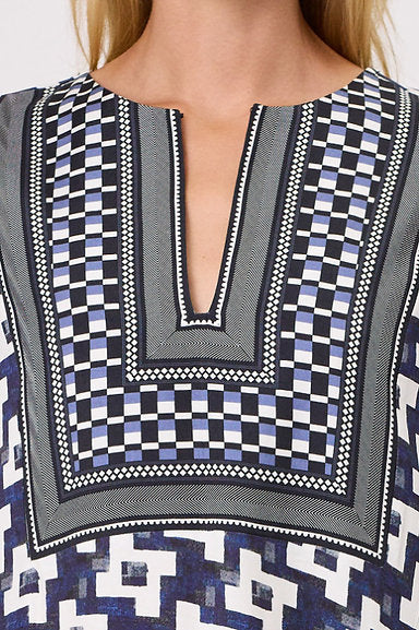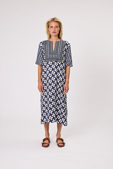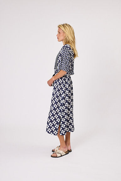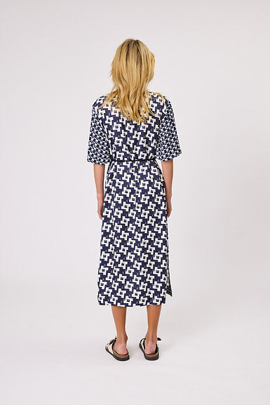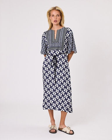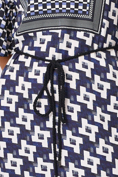 Allover Cortez print comfy dress. Set in armhole with wide bell sleeves. Round neckline with hook and eye opening at front. Midi length with side splits at hem. A separate rope belt that can be wear with or without it.