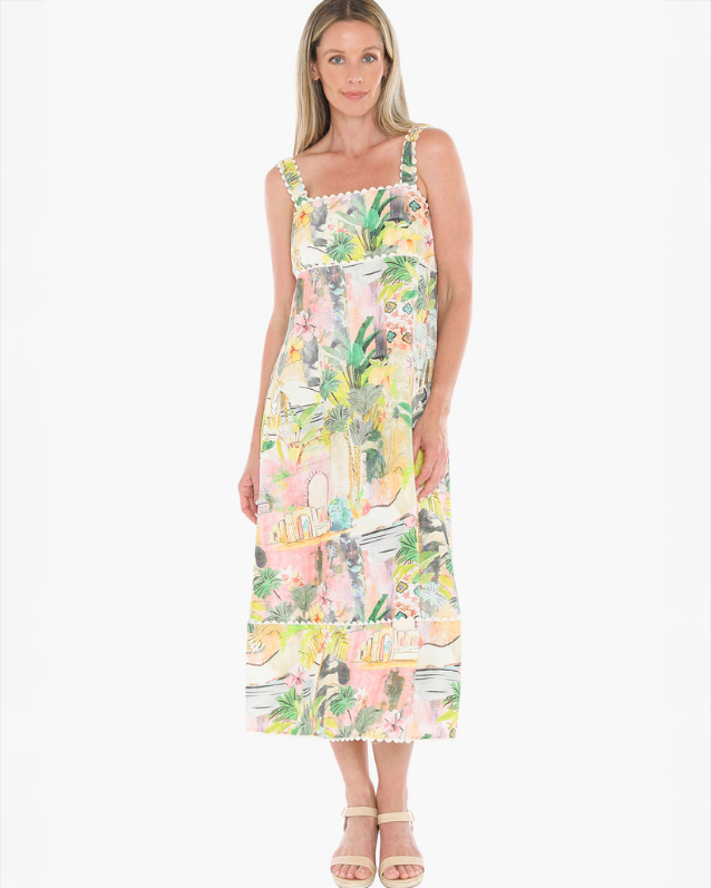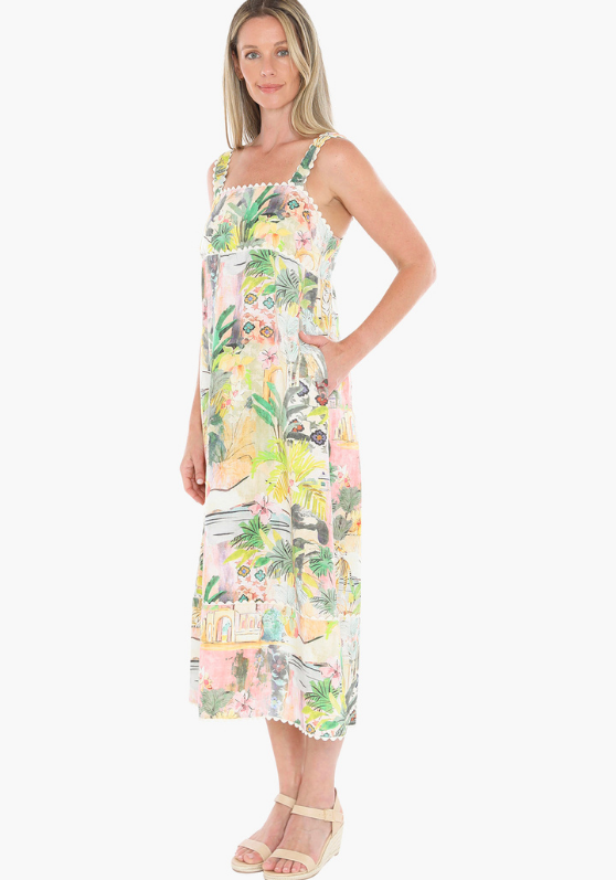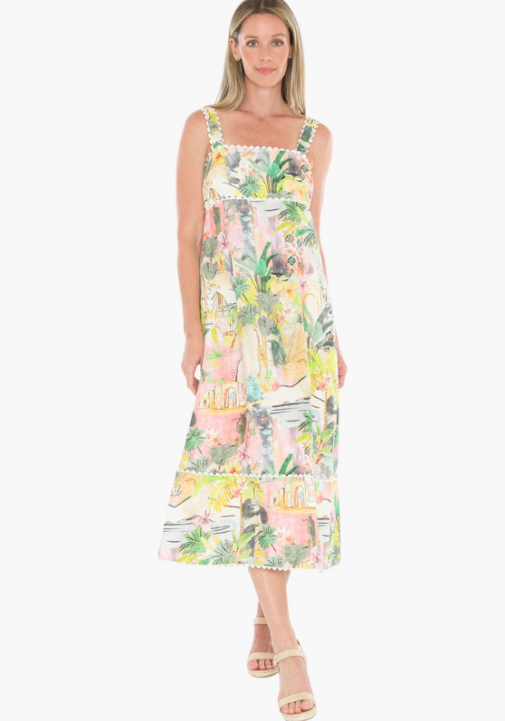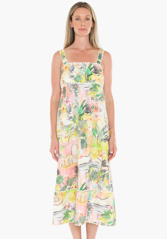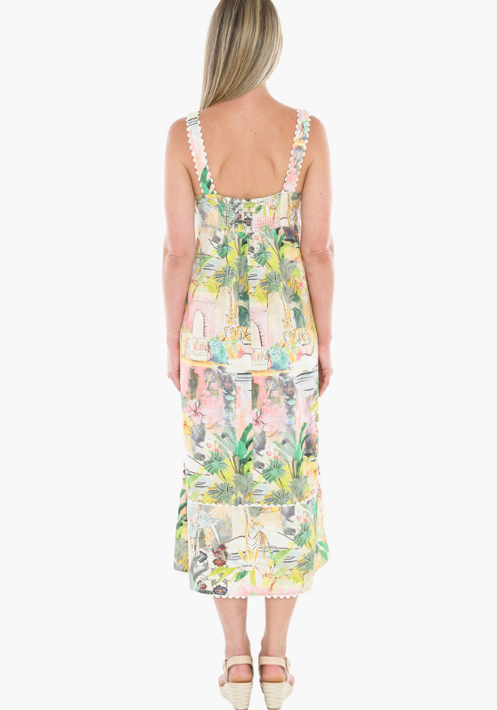 The Tiger Island Ric Rac strappy dress features a rouched back, midi length, and two side pockets.