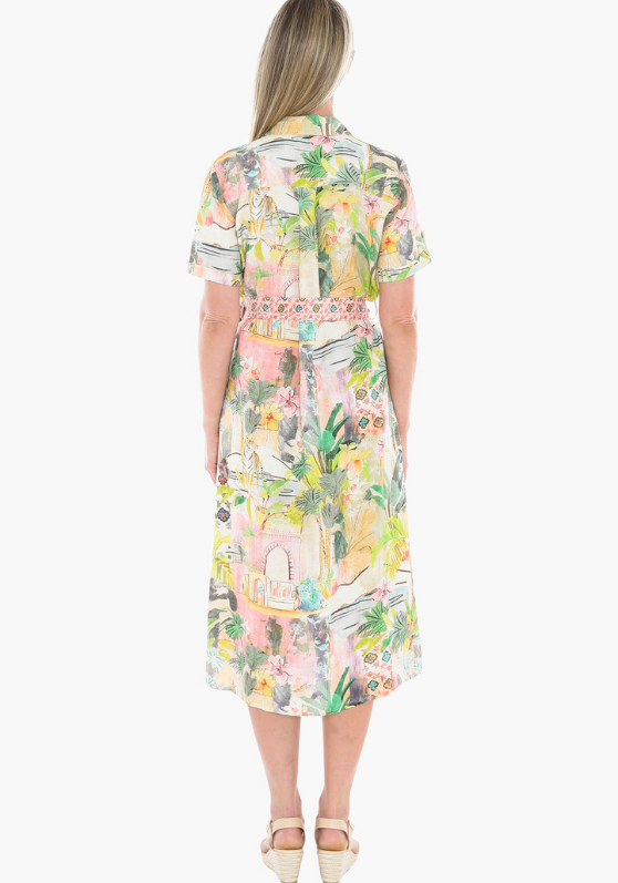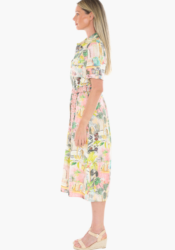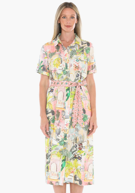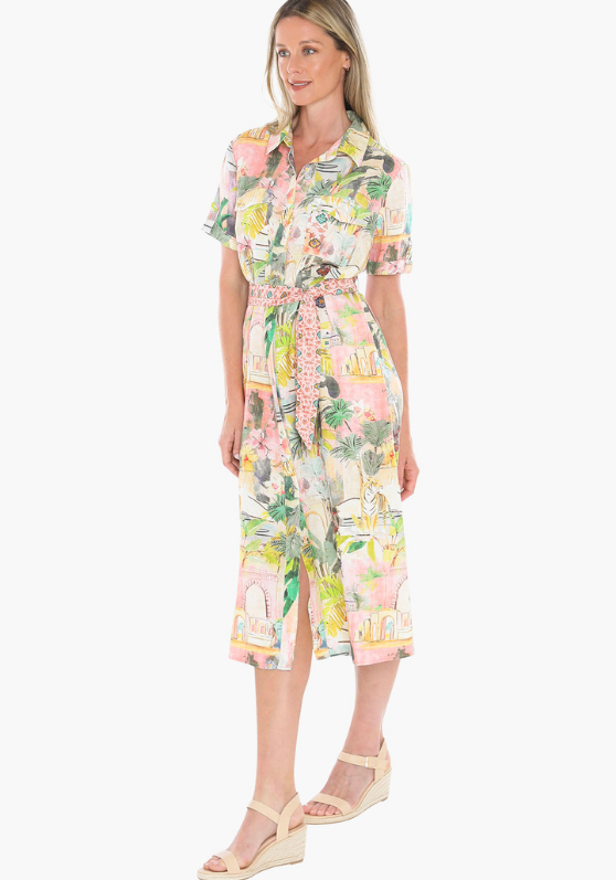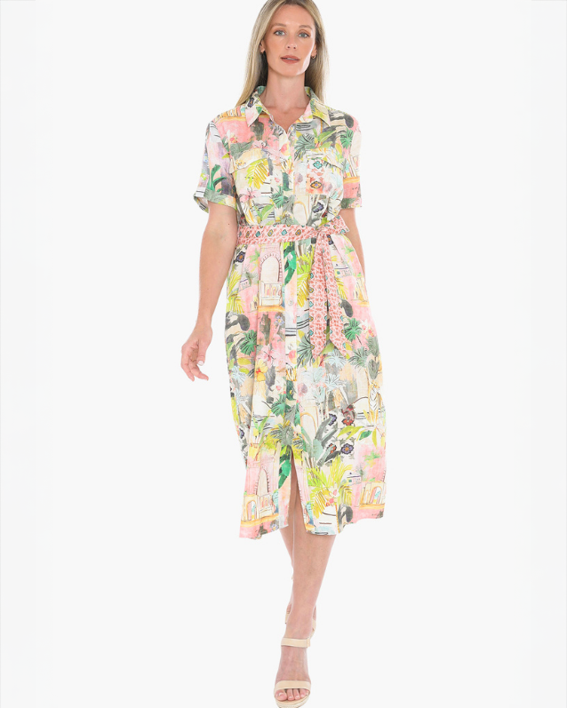 The Tiger Island Tie Waist Shirtmaker Dress features short tabbed cuffed sleeves, 4 pockets, covered buttons, midi length.