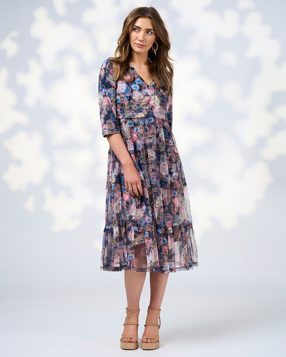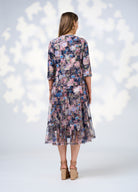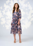 Printed tiered tulle dress with a V neckline and 3/4 length sleeves. Gathered tiers feature a tuck at the top edge of seams. Fully lined.