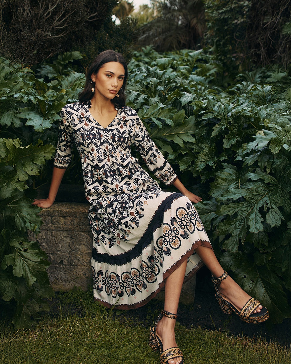 Cotton midi dress with a collared V neckline and curved under bust seam, with hem tiers, and hidden in-seam side pockets, with blouson sleeves and elasticated cuffs.