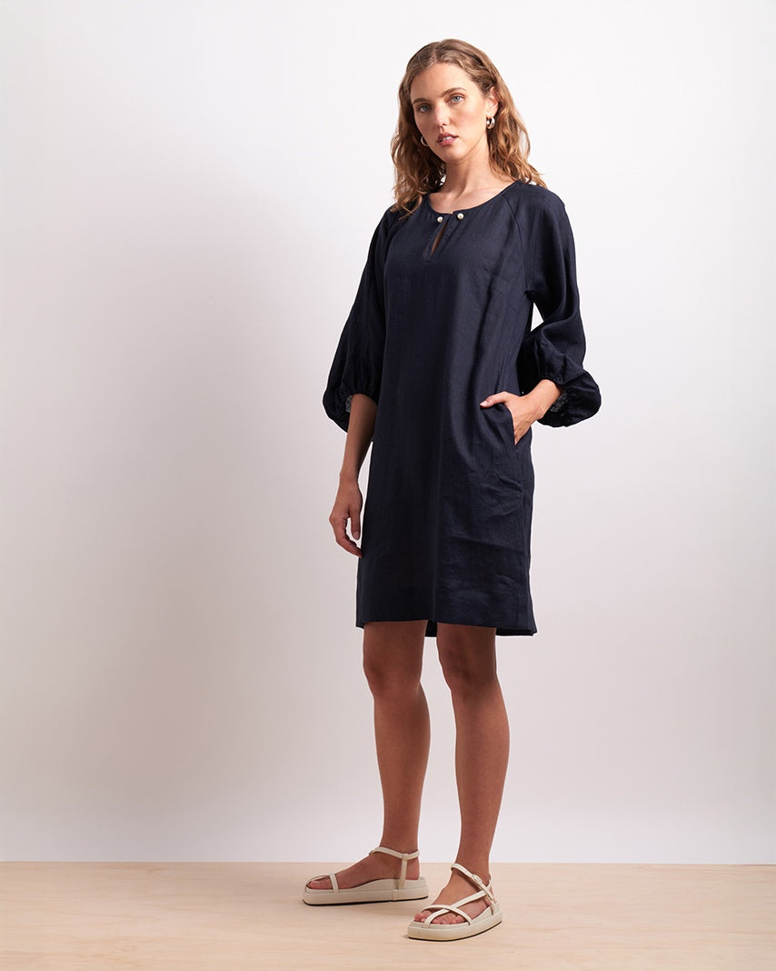 A modern classic, the Baubles Dress is cut from 100% linen. This knee-length dress features a scoop neck and keyhole neckline that does up with a removeable pearl closure. The dress has long bell sleeves with elasticated cuffs and side pockets. An ideal relaxed fitted dress ideal for everyday wear.