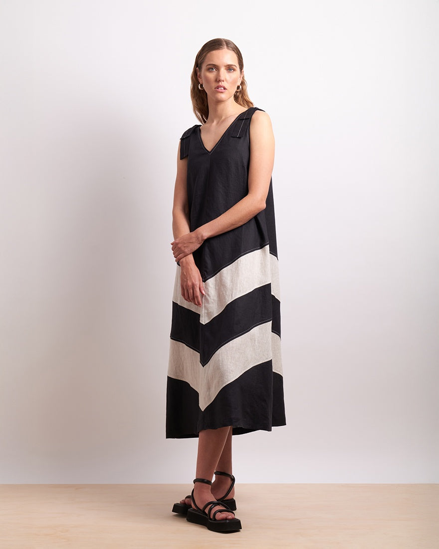 The Mixer Dress has a V-neckline and square back with bow details on the shoulders. Contrasting panels and chevron contrast stitching elevate this 100% linen A-line shape. Incredibly versatile, the bold color play and artisanal detailing, come together to create a polished modern dress.