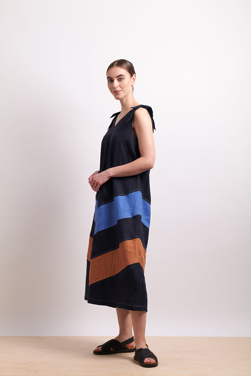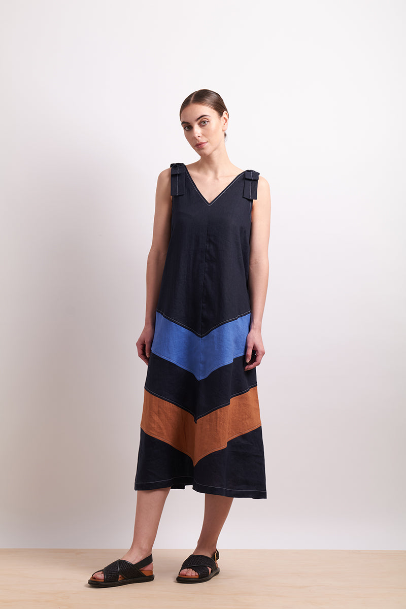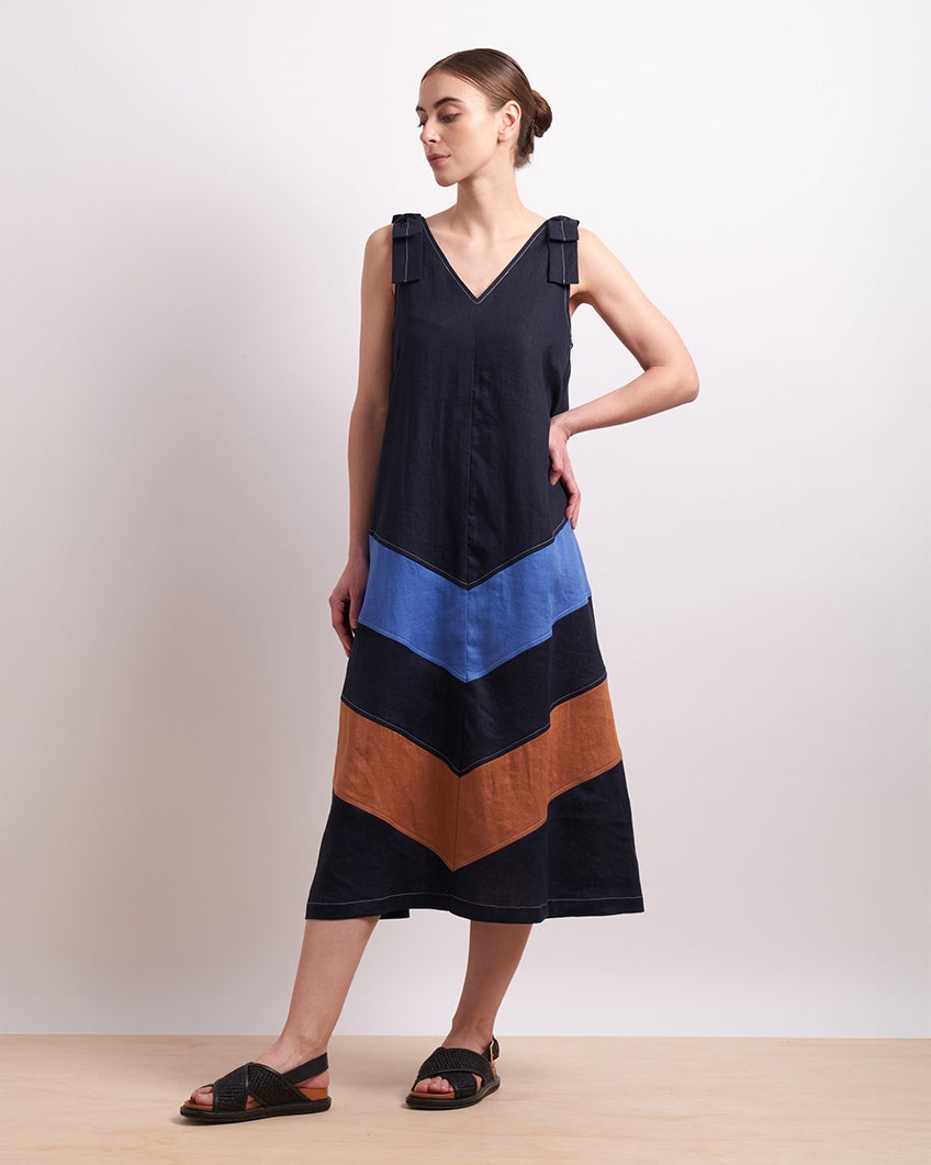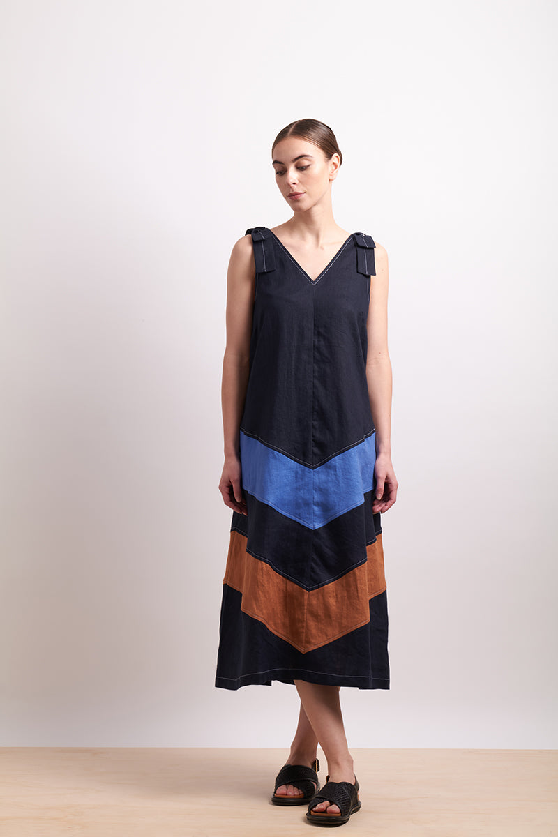 The Mixer Dress has a V-neckline and square back with bow details on the shoulders. Contrasting panels and chevron contrast stitching elevate this 100% linen A-line shape. Incredibly versatile, the bold color play and artisanal detailing, come together to create a polished modern dress.
