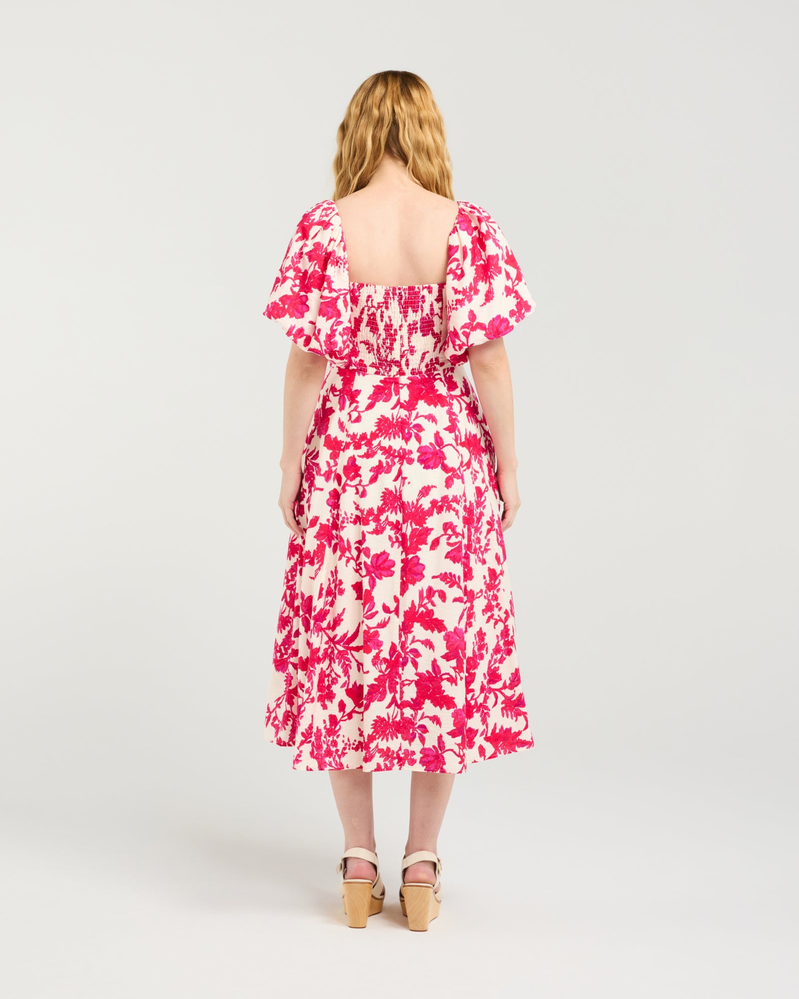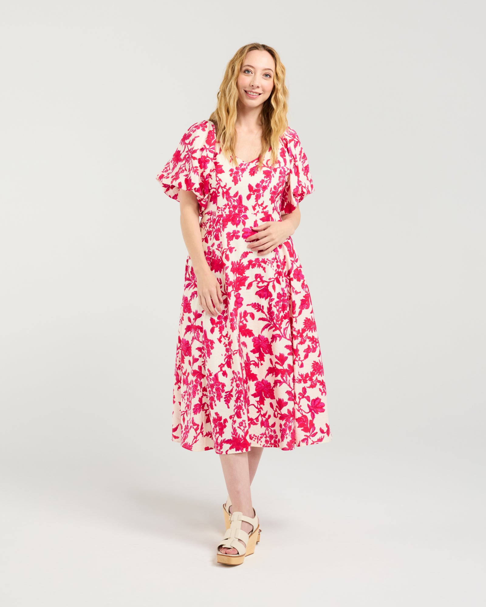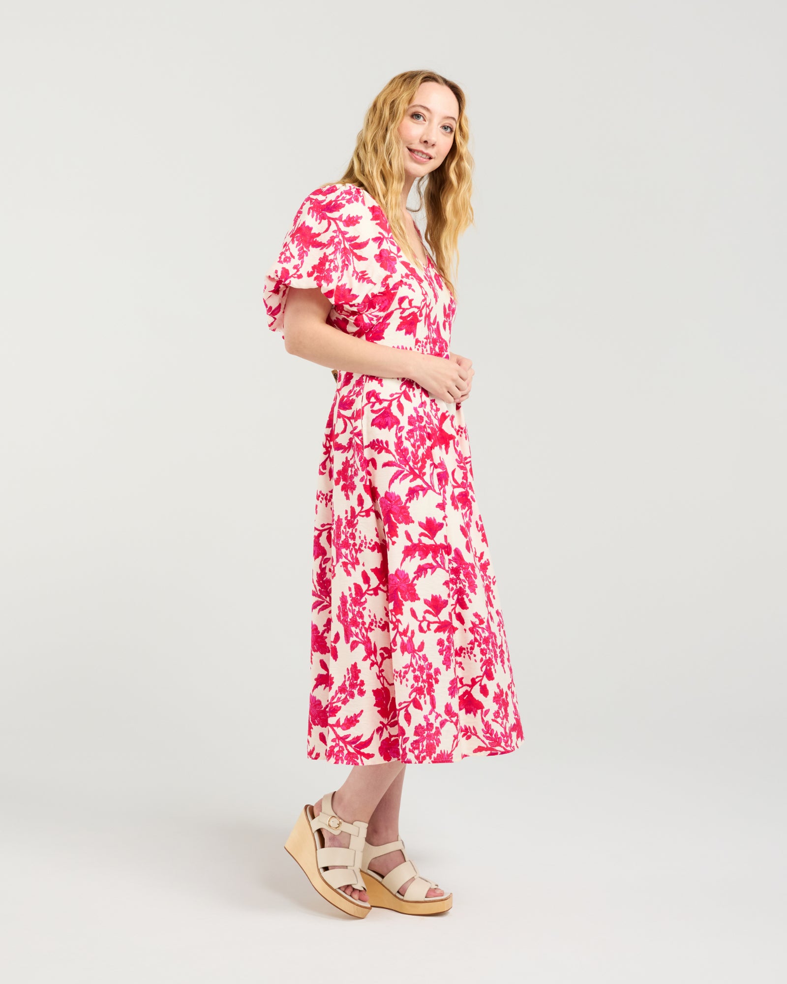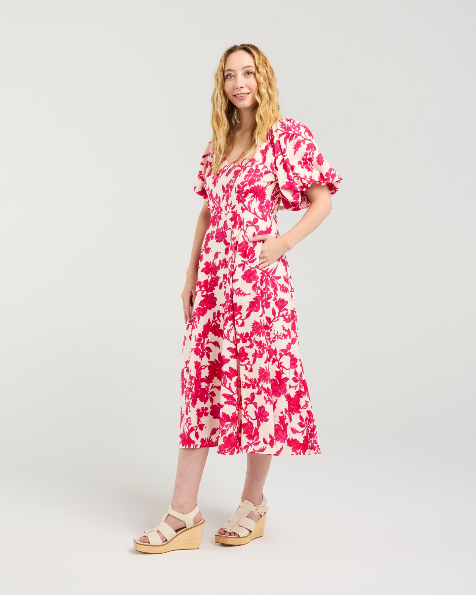 This dress makes a statement with its vivid magenta floral print and flattering silhouette. Short puffed sleeves add volume and a playful touch, while the V-shaped neckline brings a touch of elegance. Designed to stand out, it’s a perfect balance of romantic charm and modern edge — ideal for garden parties, brunch dates, or any moment that calls for color and confidence.
