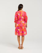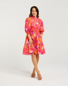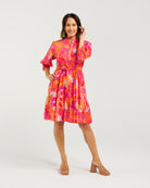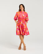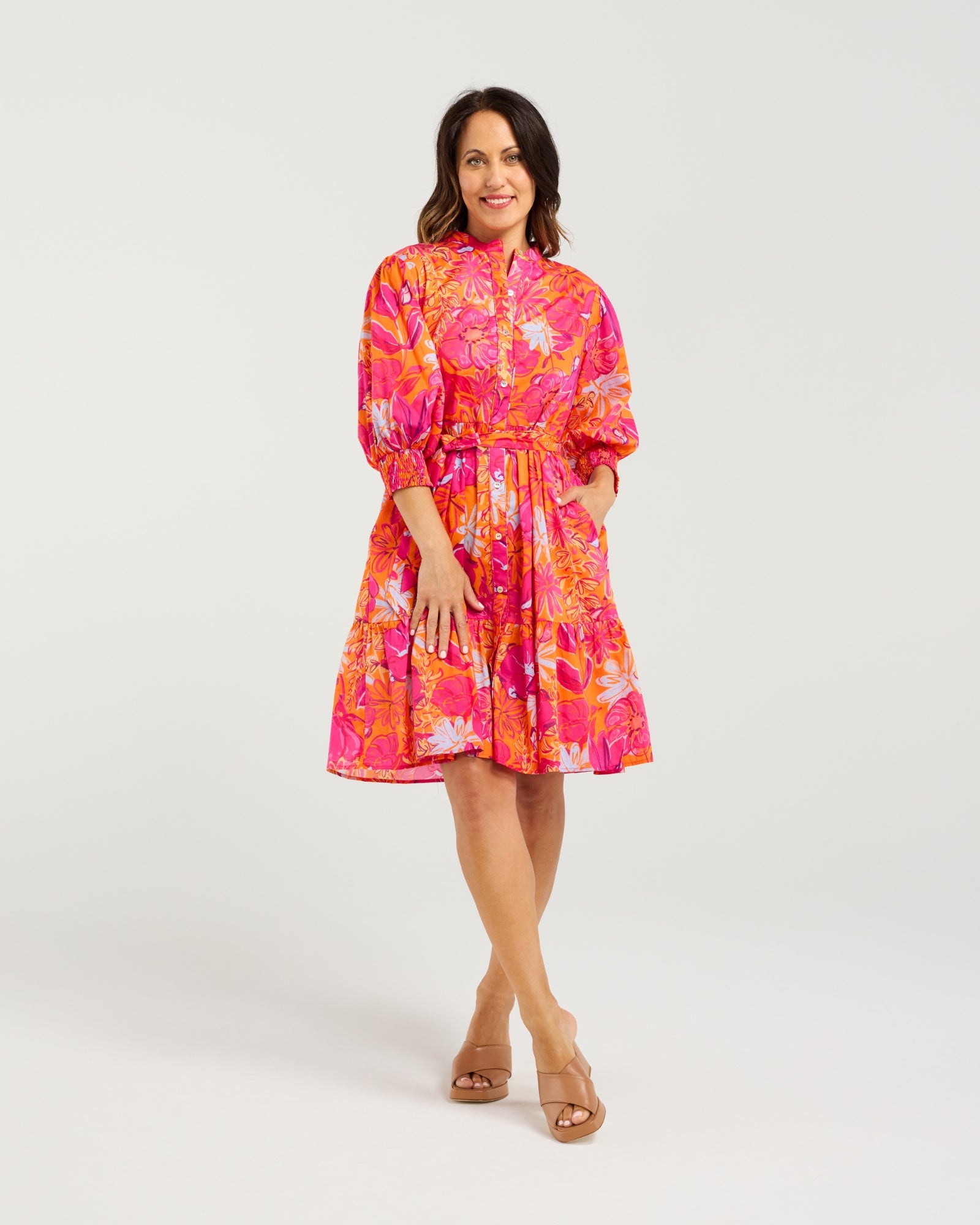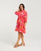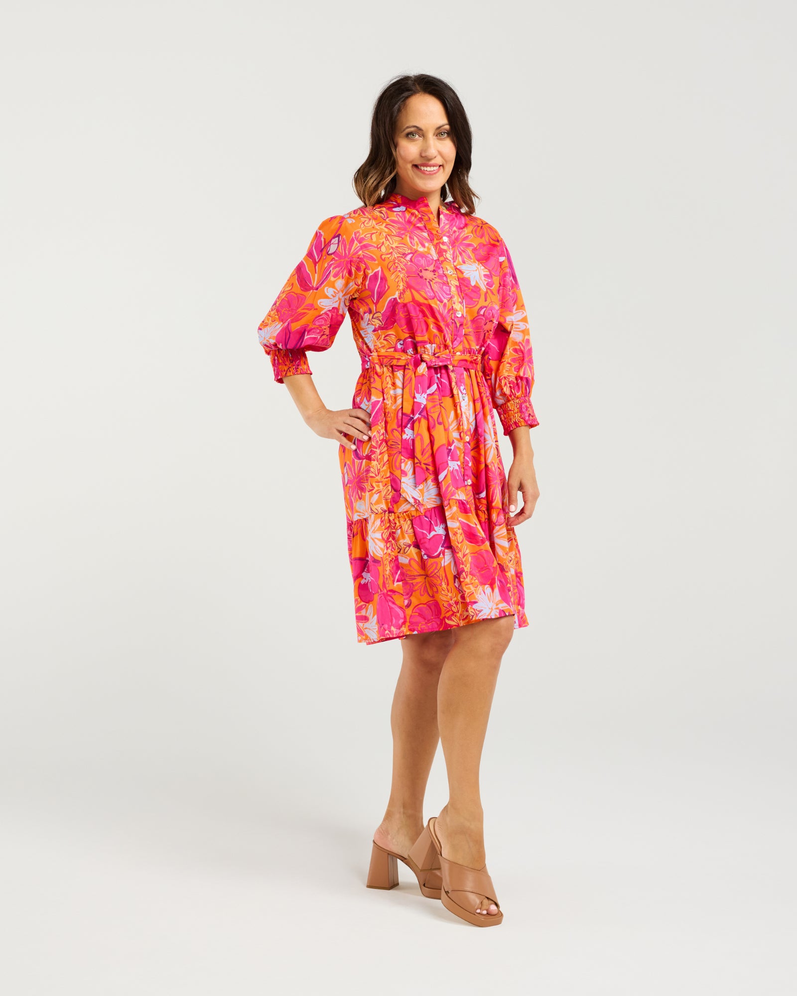 This vibrant shirt dress features a bold orange and pink floral pattern that commands attention with its lively, energetic vibe. The design includes classic shirt details with a structured collar and button-down front, while the shirred cuffs add a delicate, gathered finish to the sleeves. A tie at the waist cinches the silhouette, creating a flattering shape. The tiered skirt adds playful volume and movement, balancing structure with feminine flow.