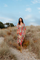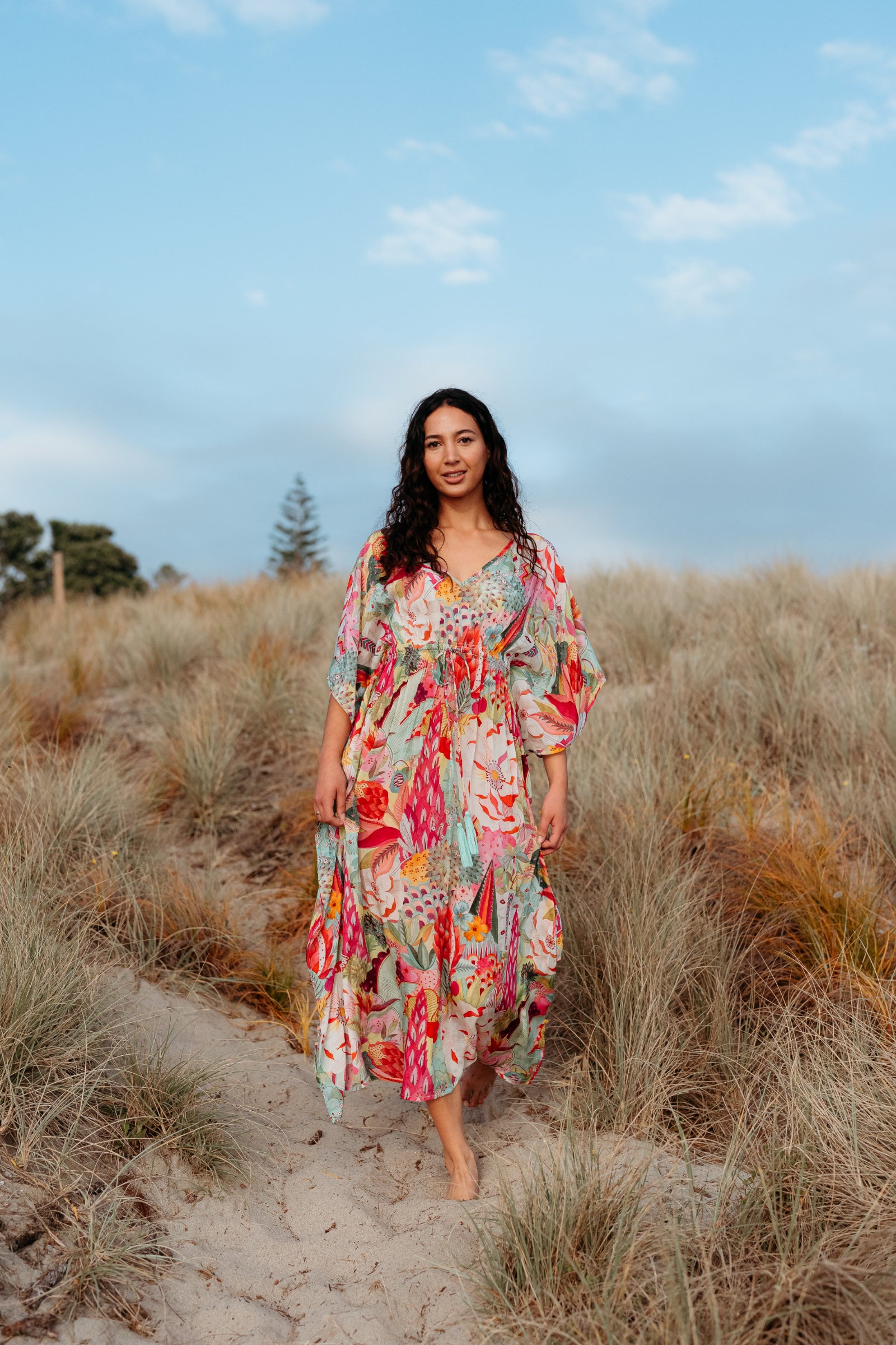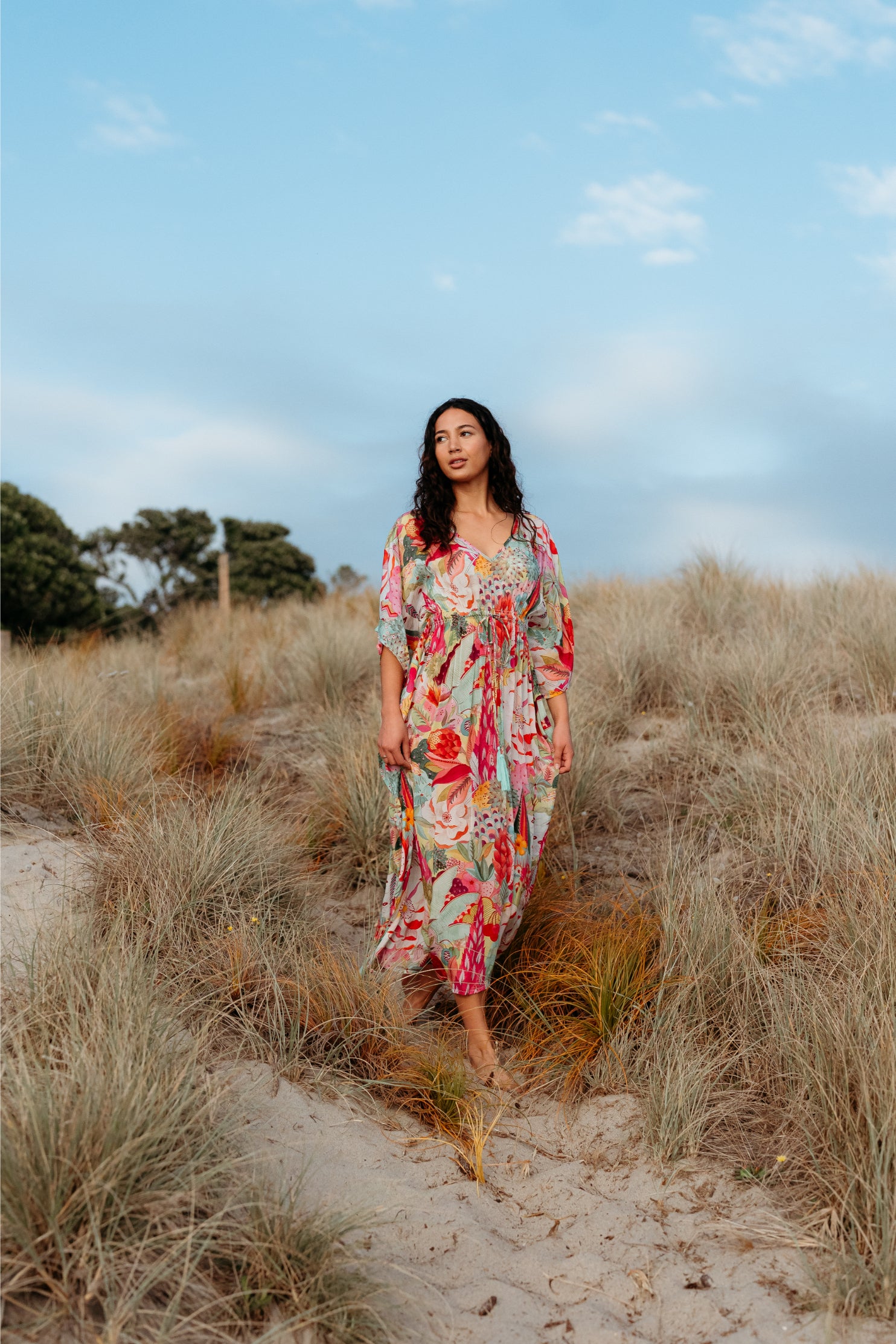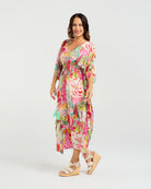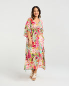 This cheerful kaftan showcases a relaxed silhouette in a playful summer print bursting with colorful fruits and blooming flowers. Designed for comfort and style, it features a waist tie that offers adjustable shaping while preserving the breezy, effortless feel of the garment. The lightweight fabric makes it perfect for warm-weather days whether by the beach, pool, or on a sunny stroll. Vibrant and fun, this kaftan captures the joyful spirit of summer in a bold yet easygoing look.