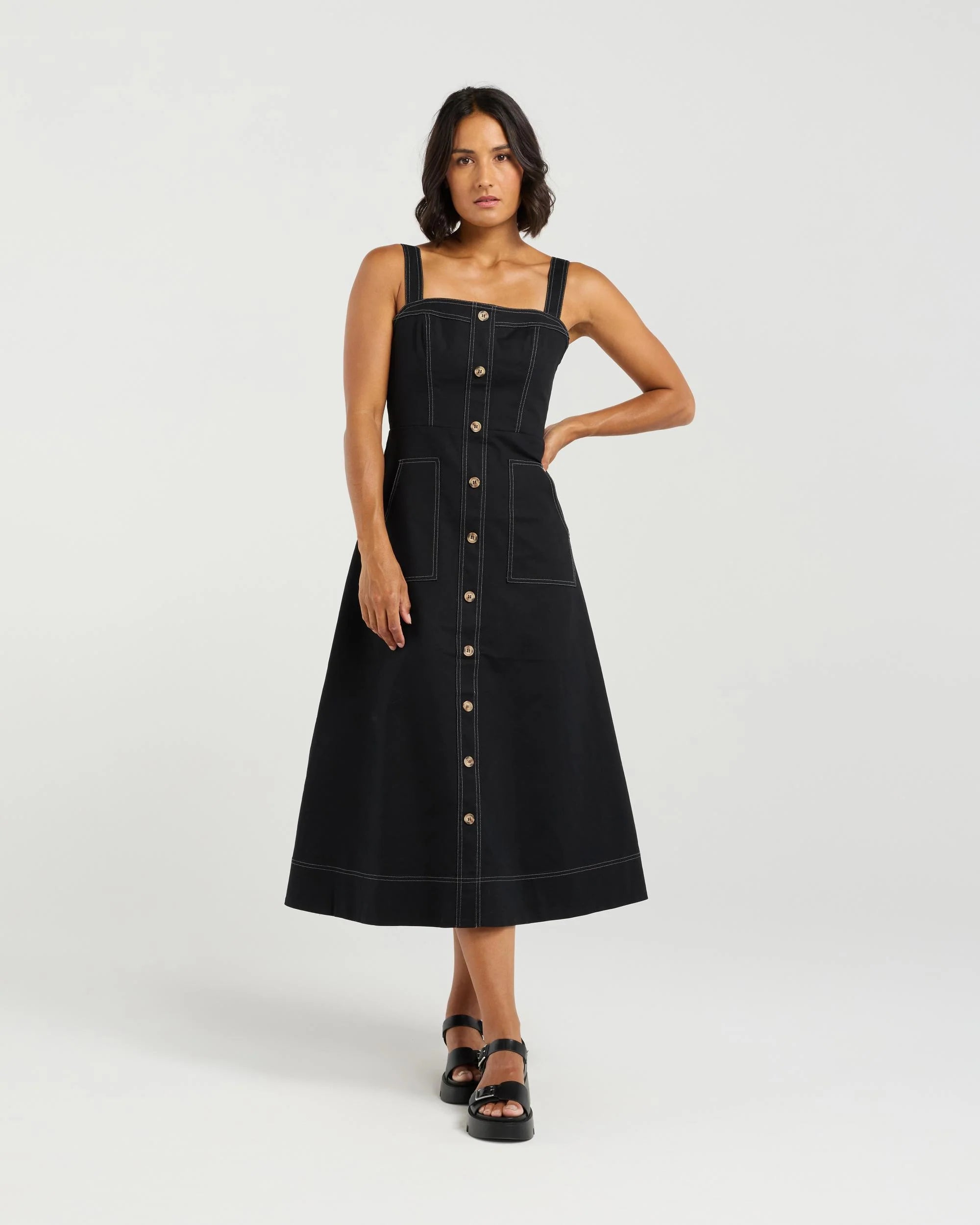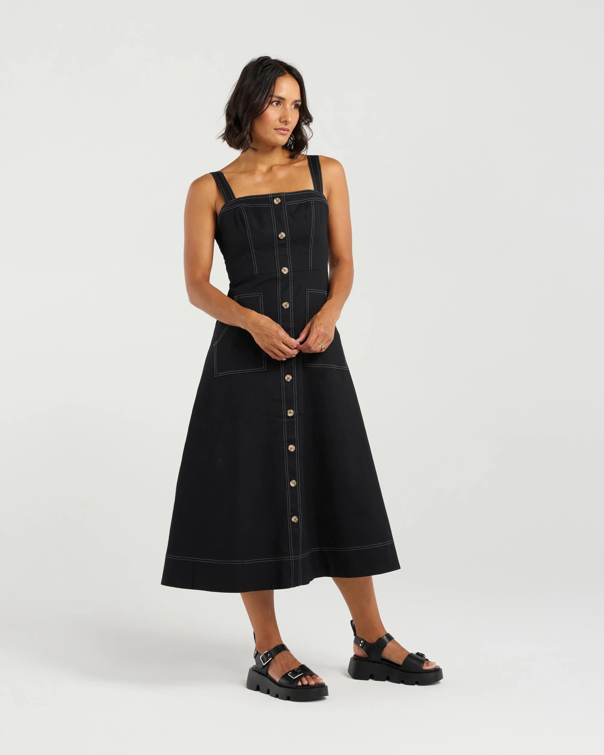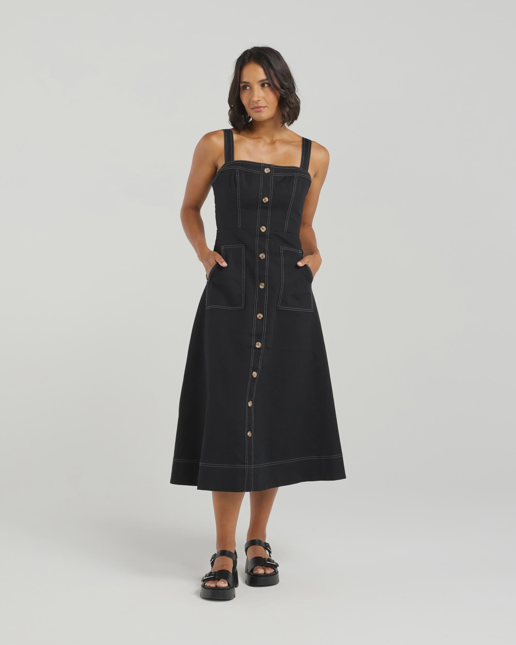 This dress effortlessly blends classic styling with contemporary details. Fabricated in a stretch fabric the fitted bodice contours to the figure, while the A-line skirt offers a flattering silhouette. Adjustable straps provide a customizable fit, and the contrast stitching adds a modern touch. The button detail completes the look, making it a versatile piece. Layer with a tee for a pinafore look or dress it up with heels and this dress is sure to be on high rotation.