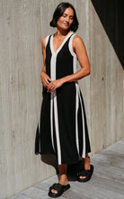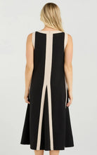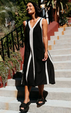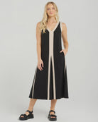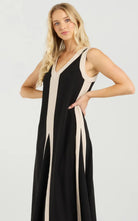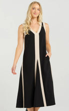 Striking in its simplicity, this sleeveless V-neck dress is designed to flatter with clean lines and thoughtfully placed contrast panels that elongate the silhouette. Cut for ease and movement, the streamlined shape is elevated by the unexpected practicality of side pockets. A modern essential that balances structure and softness—perfect for day-to-night wear.