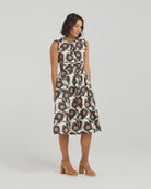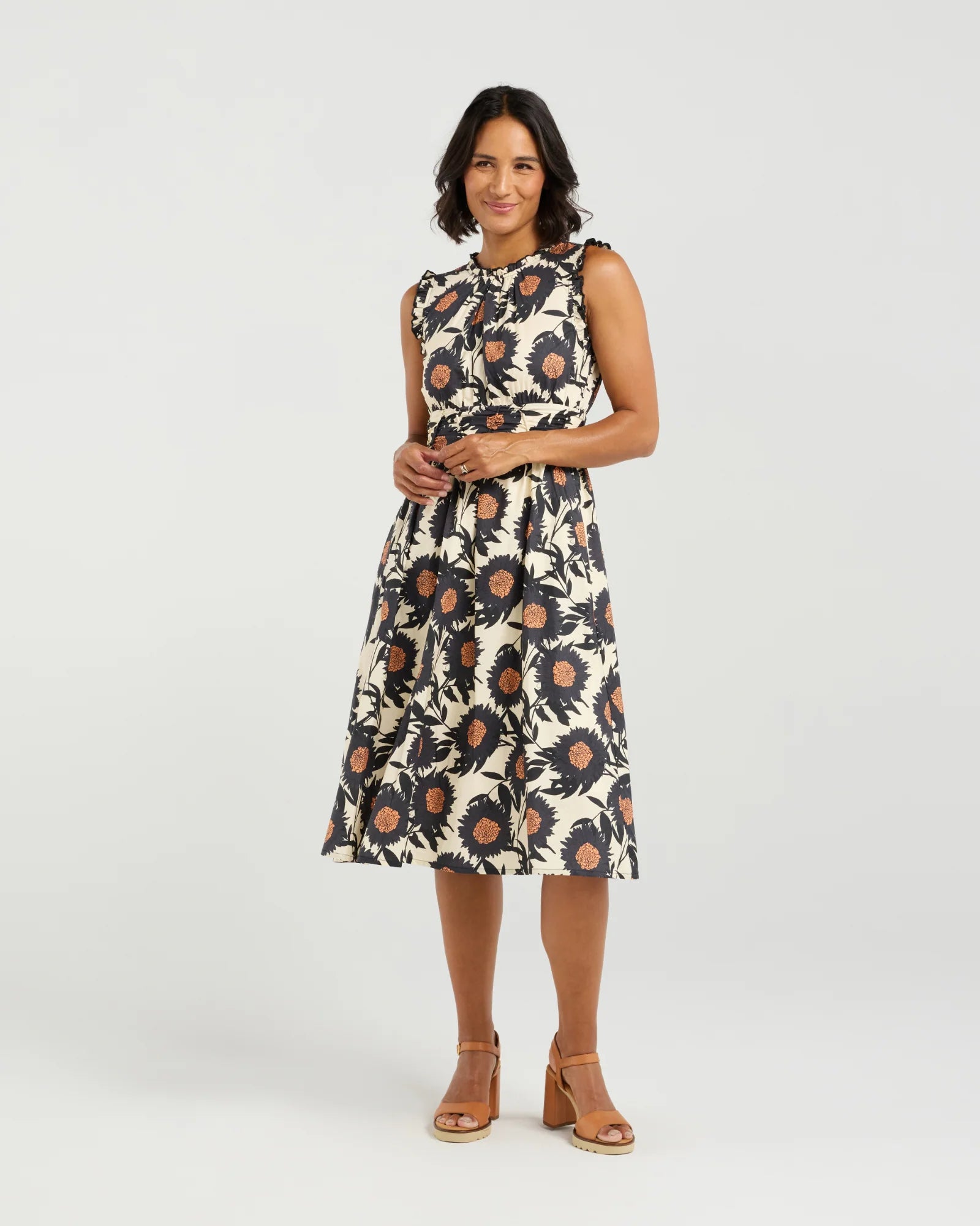 Romantic yet tailored, this sleeveless dress features a beautifully fitted bodice and a nipped-in waist that flows into a softly structured A-line skirt. Delicate frill detailing at the neckline and armholes adds a feminine touch, while piping detail at the waist highlights the more fitted silhouette. Perfect for this summer BBQ's with sandals or with a heel for a summer wedding.