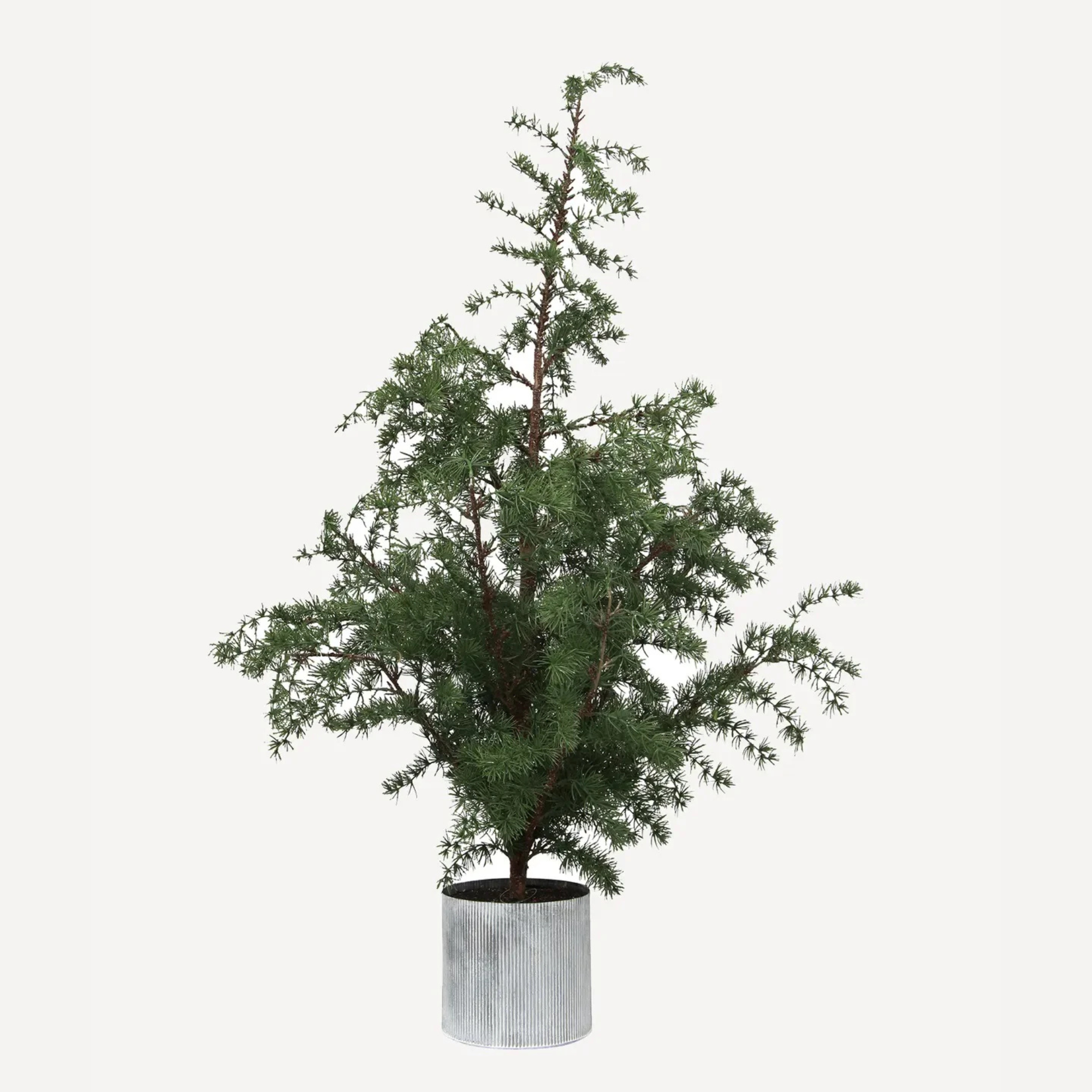 A traditional nordic tree with delicate needles and realistic branches sits in a galvanised zinc pot to add a touch of vintage charm to your decor.