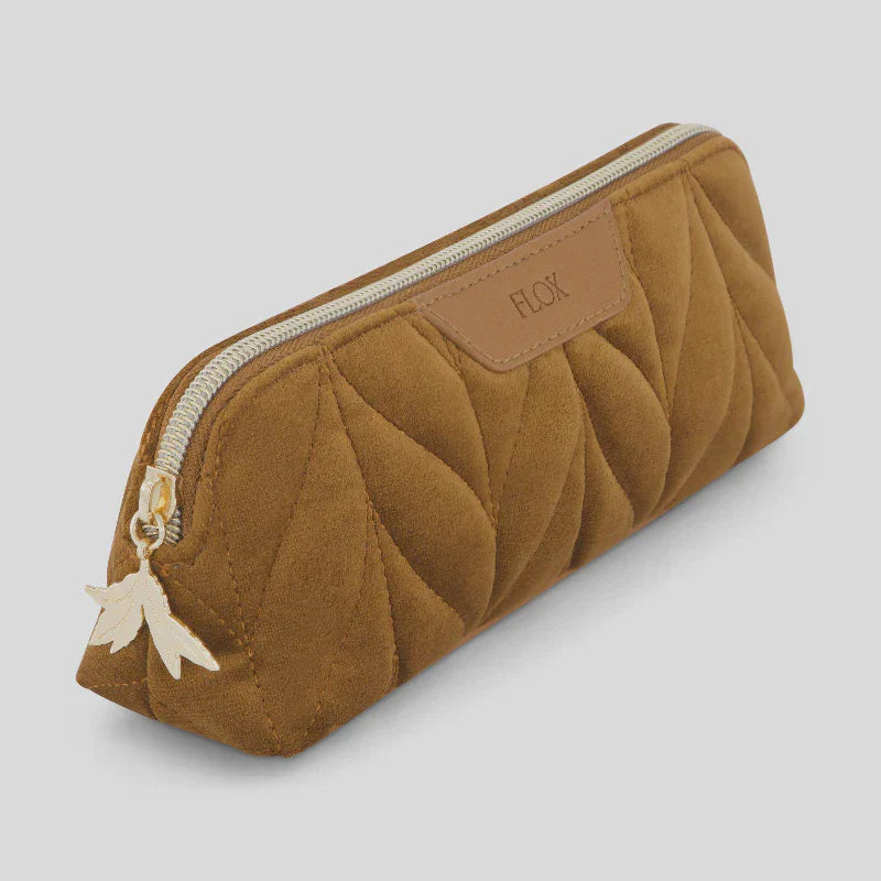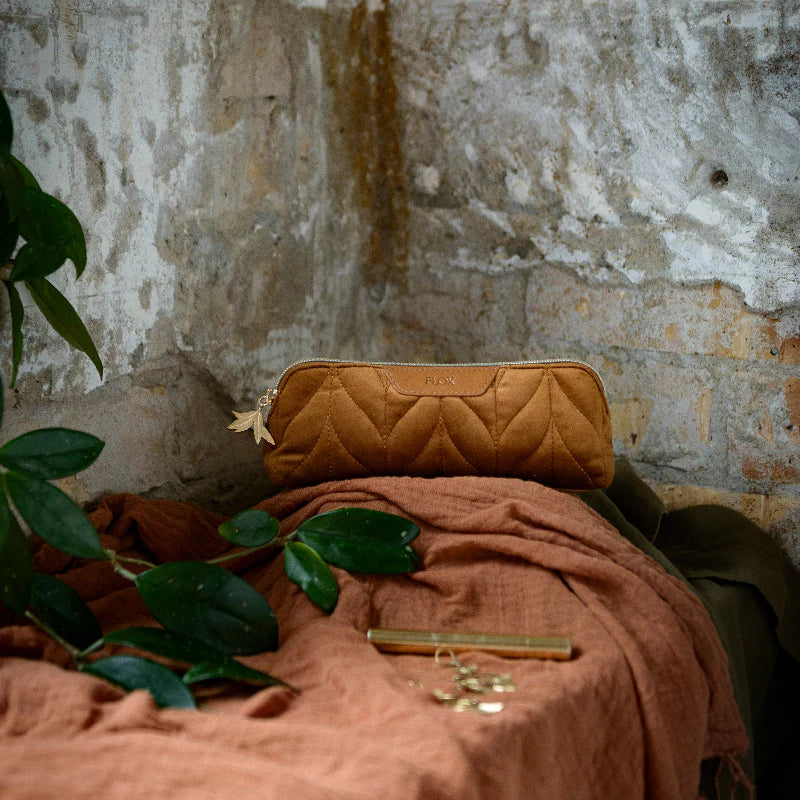 Luxurious in feel and compact in size, the Ahi Velvet Cosmetic (Small) is perfect for those who travel light.  Featuring a sumptuous quilted velvet texture and leaf stitching, this case is ideal for a quick overnight stay or slipping into your day bag.  Lined with FLOX’s signature artwork and completed with a custom leaf zip pull, this cosmetic case is a travel essential inspired by nature.