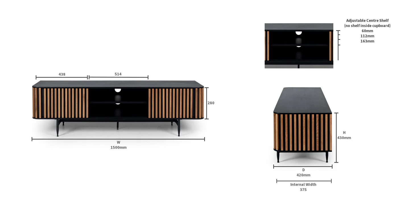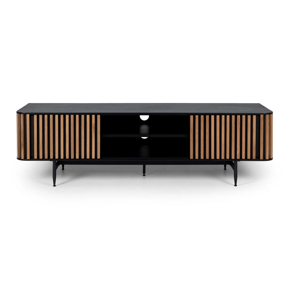 Meet the Linea. This TV Stand will make a beautiful feature in your living room with black and oak strip panels and soft-closing doors that reveal a sleek black interior.