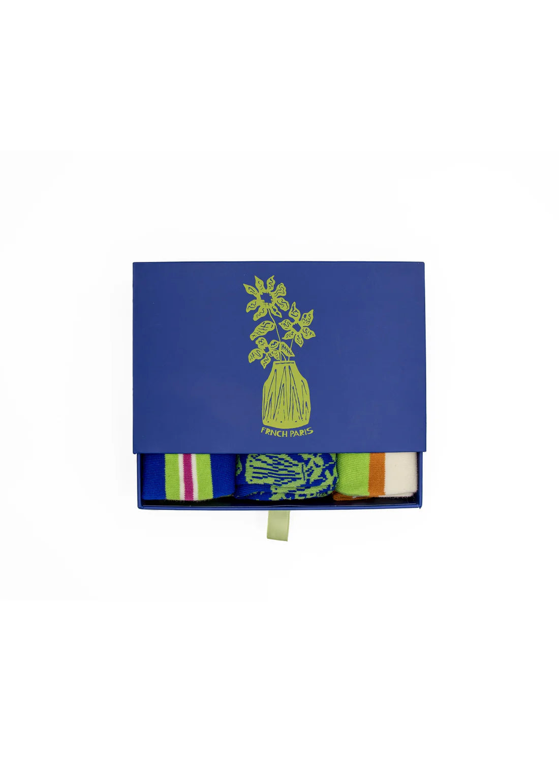 A three pack of FRNCH socks, neatly presented in a matching gift box.