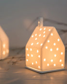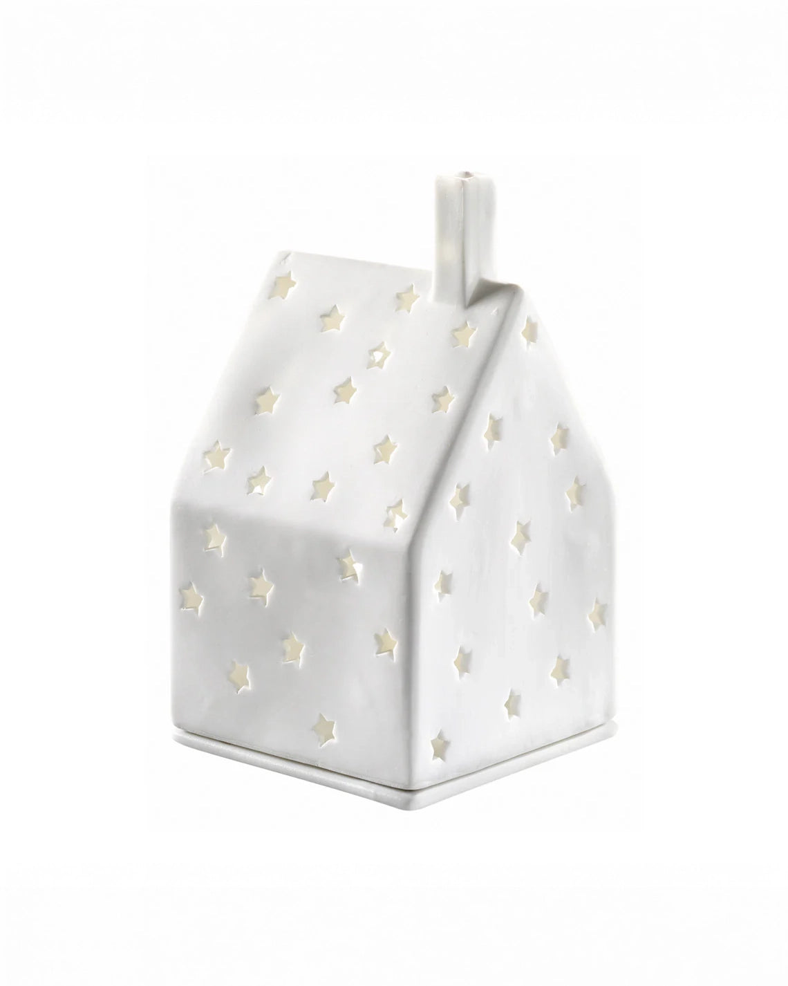 Village House with Stars is a small tealight house made of the finest porcelain that presents the magic of a starry sky and invites you to dream. This product is handcrafted with care. A galaxy full of detailed star cutouts let the light source shine through. This starlit cottage can be a source of light for your beautiful village. Beautiful house sits atop a porcelain base plate.