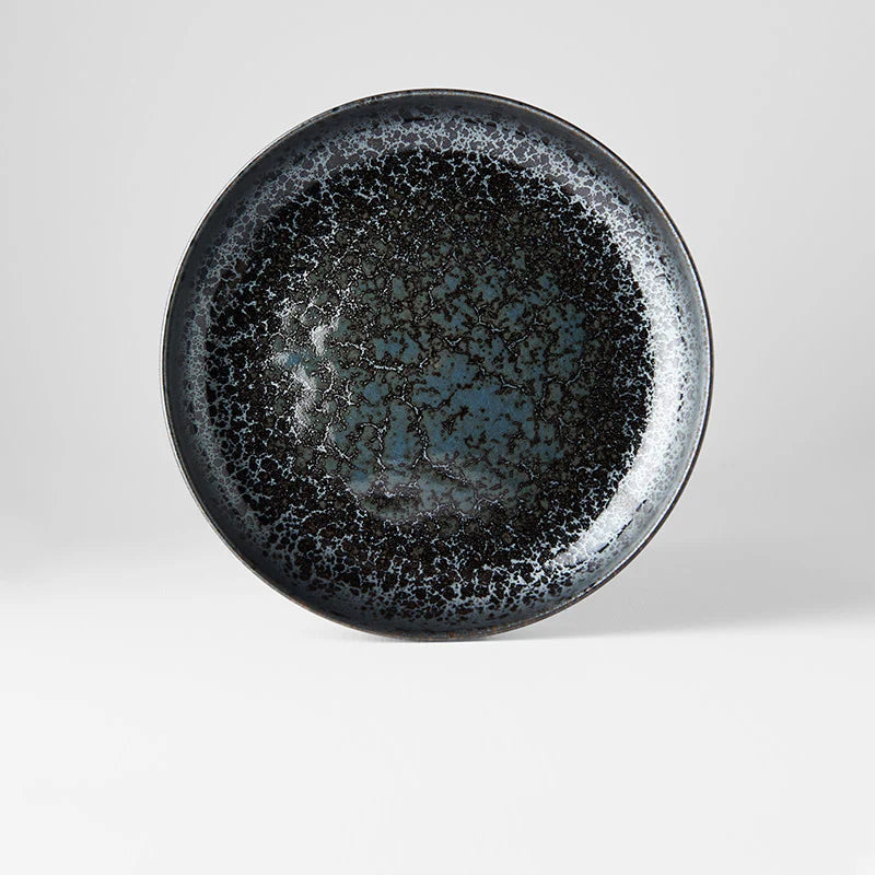 High Rim Plate in Black Pearl glaze. The Black Pearl glaze features a vibrant splash of gloss black against a matte black background. Subtle highlights of cyan are reflected in the depths of the gloss.
