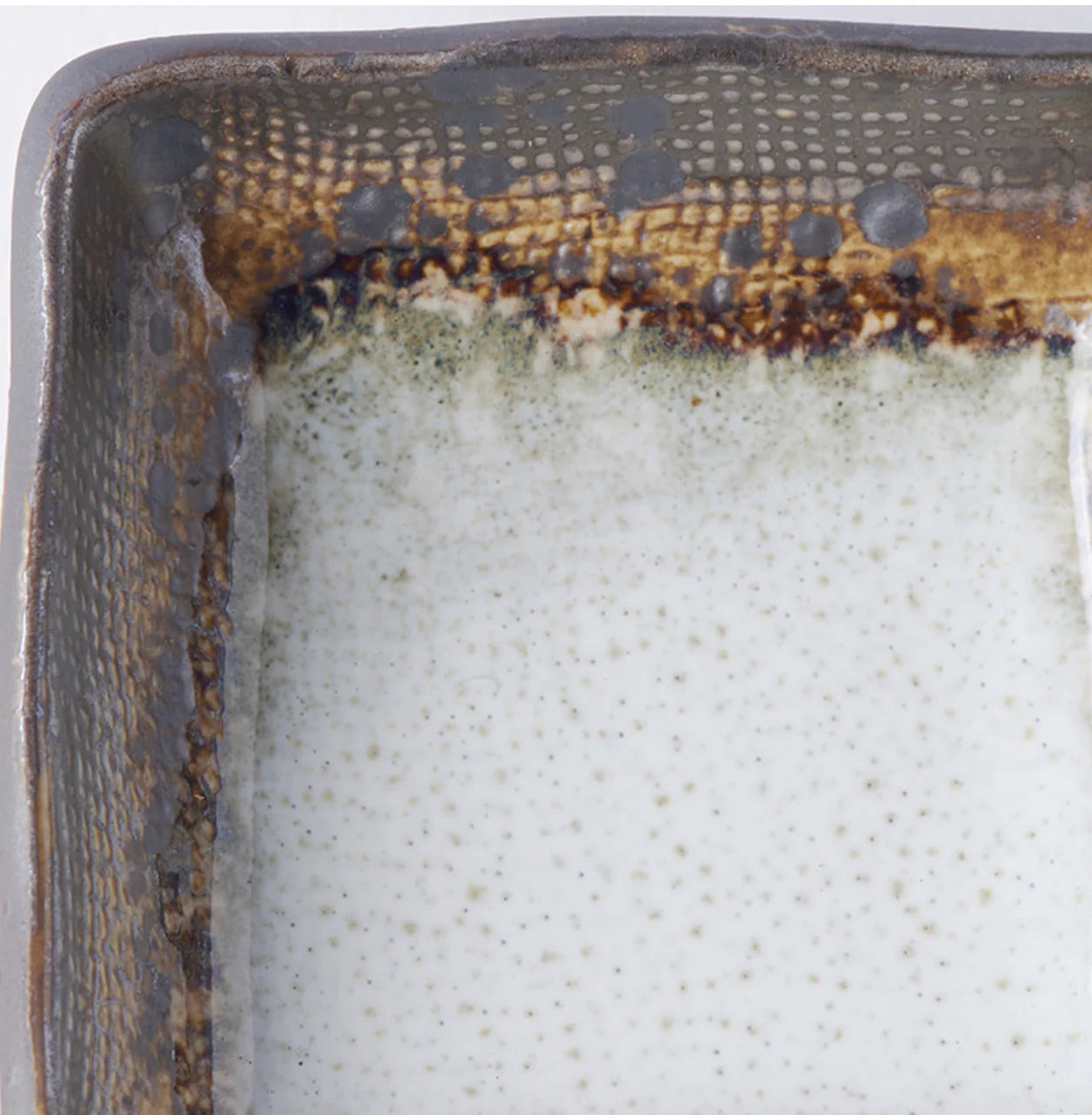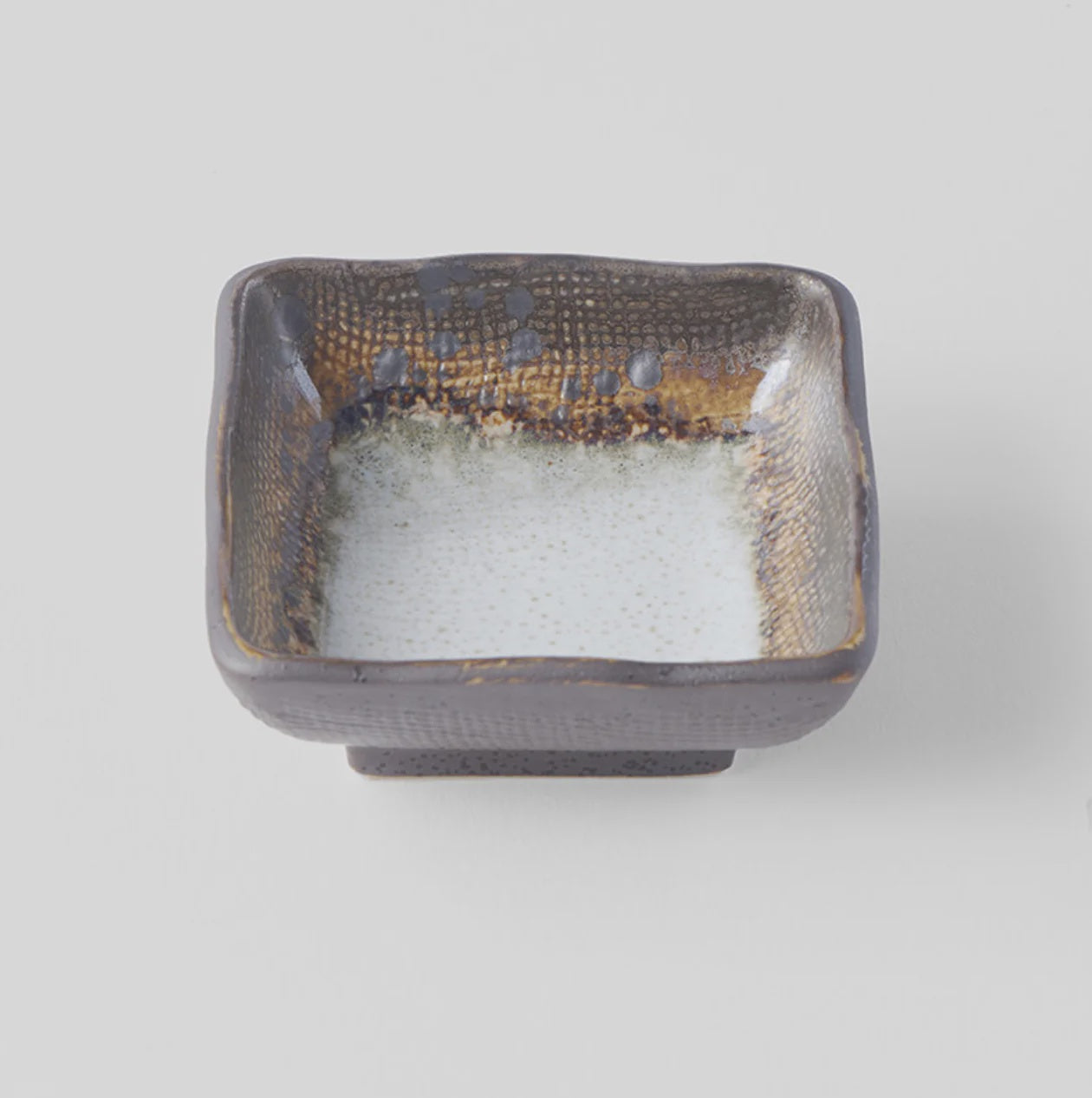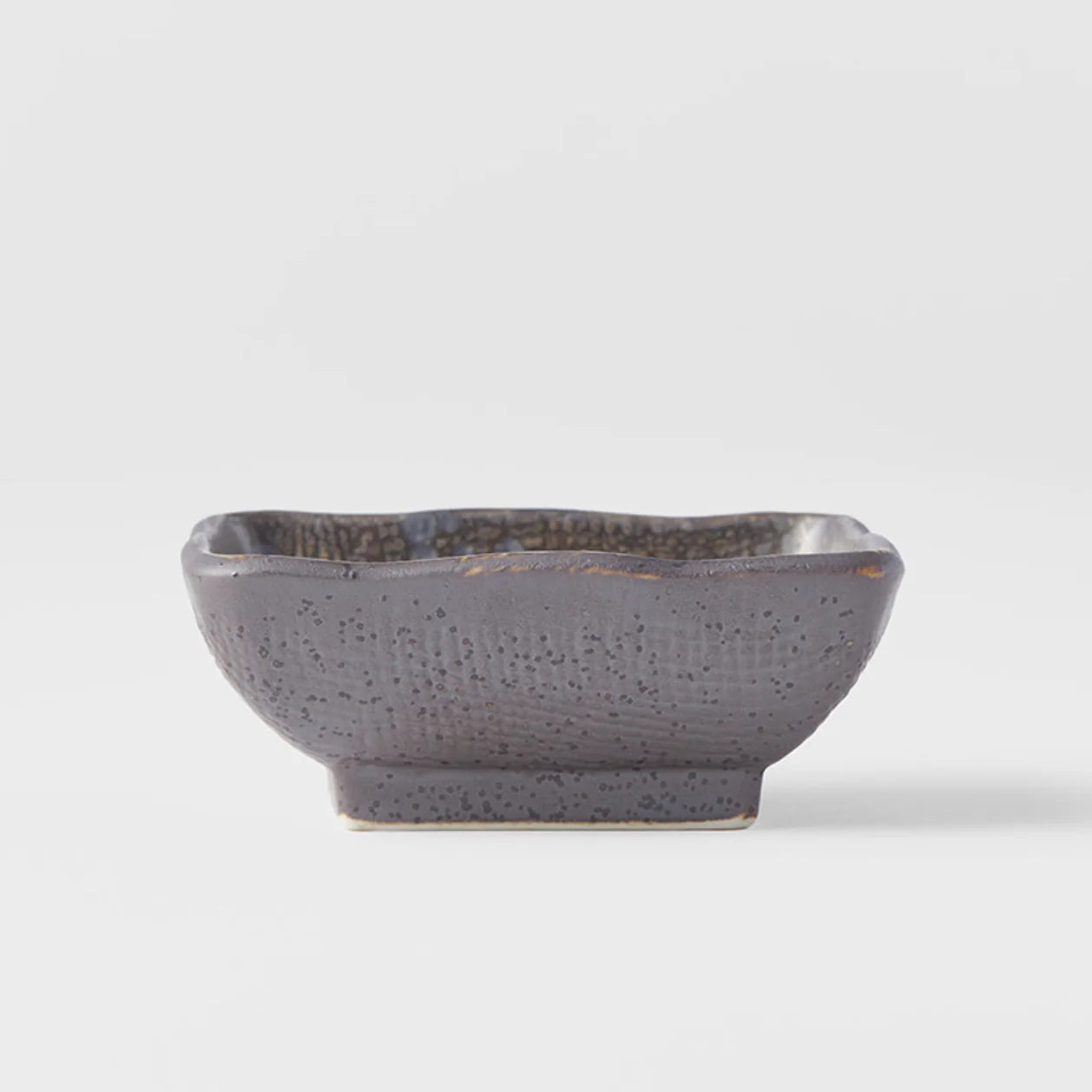 Square Sauce Dish in Akane Grey glaze. The Akane Grey range consists of organic shapes inspired by the mountainous region of Gifu prefecture. A softly speckled grey is complimented by a strong border of matte copper tones. Taking inspiration from nature and 'wabi sabi' culture, they are renowned for their glass glazes and vivid colours.