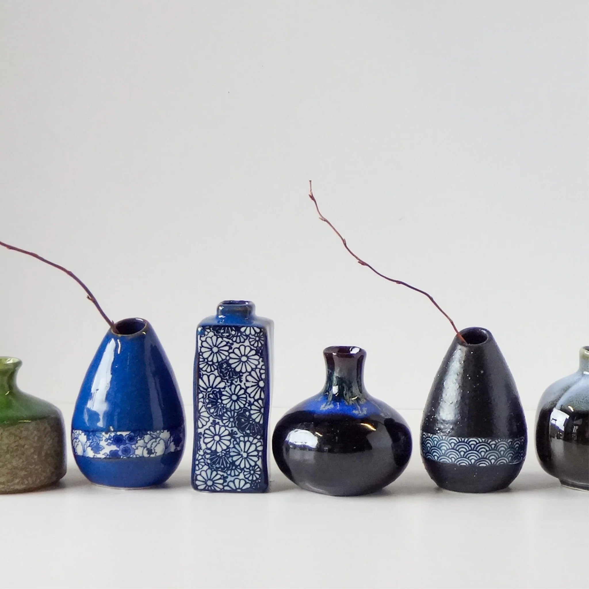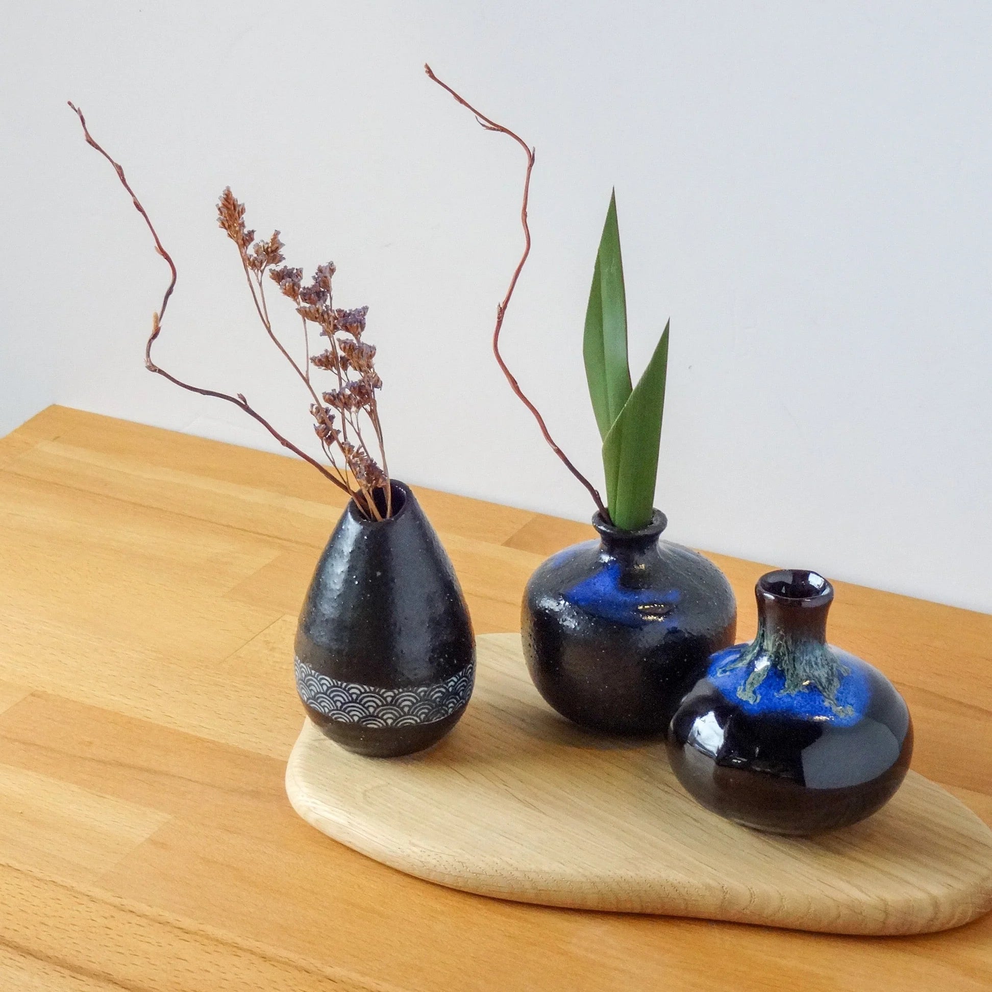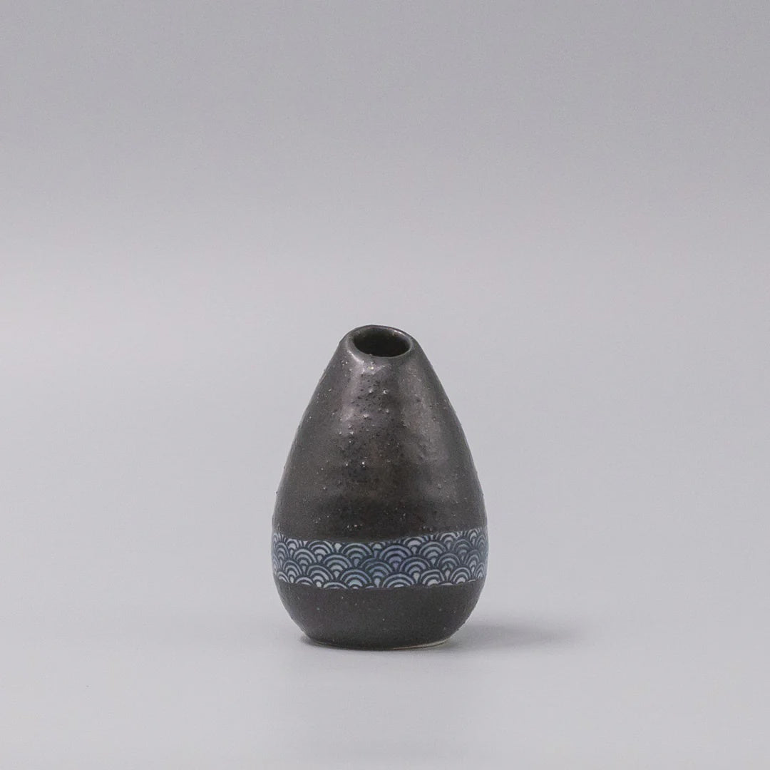 Black pinecone vase with indigo wave. Perfect for adding small floral accents to your desk, kitchen or bedside table.