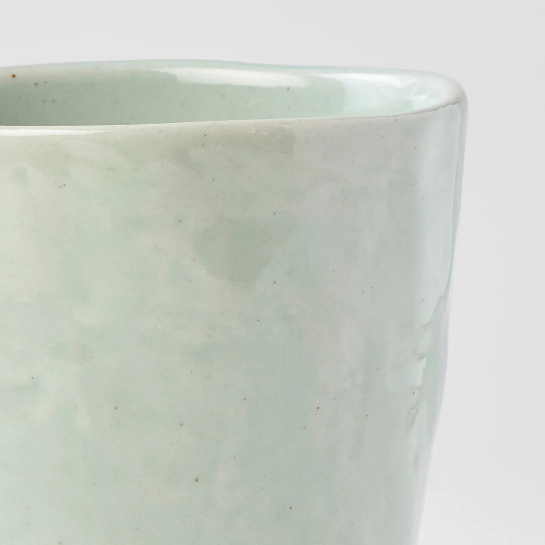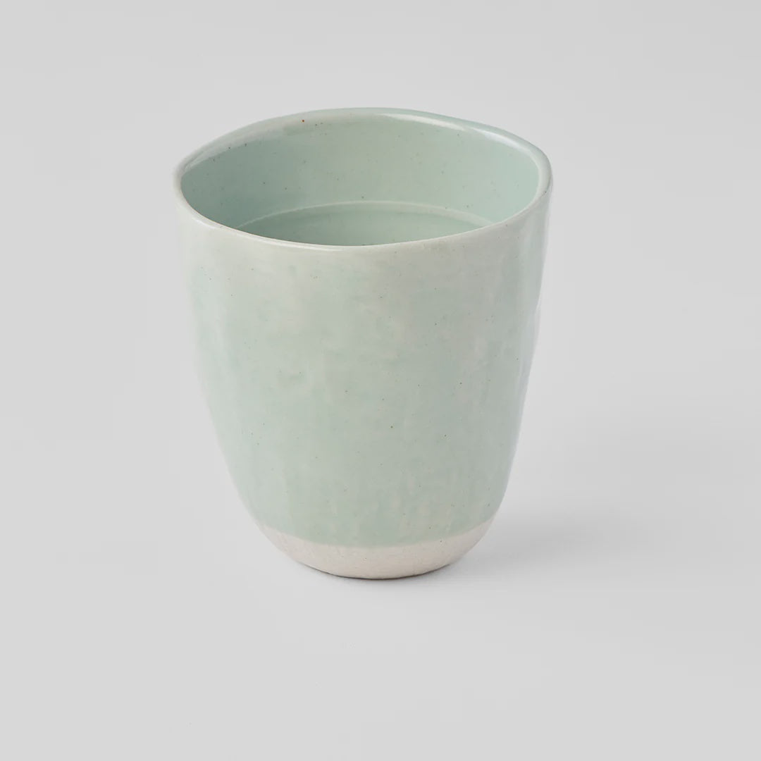 Lopsided large mug in teal glaze. Featuring a light teal glaze in a lopsided shape. Made of 'Minoyaki' porcelain, fired at a high temperature and hand finished at a long-standing family run kiln in Japan.